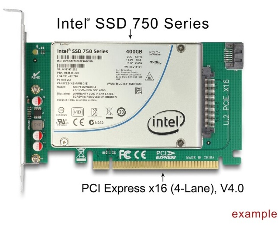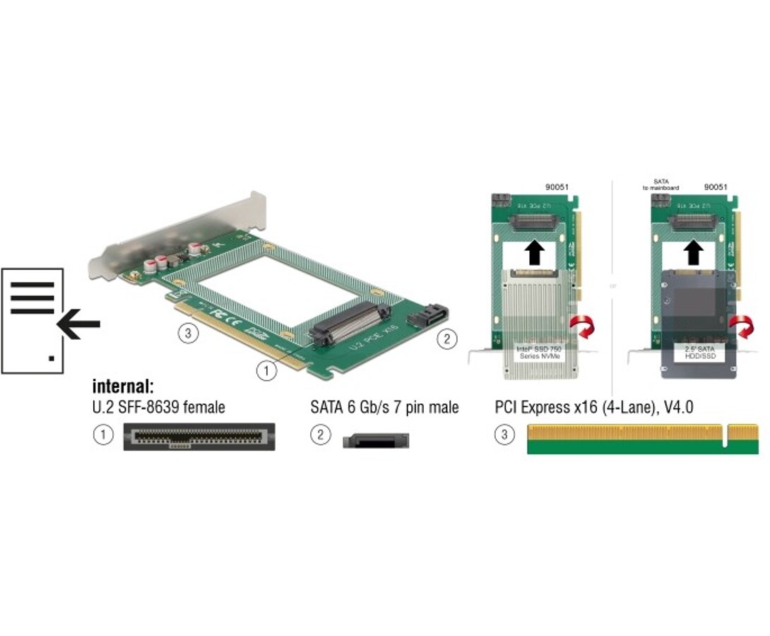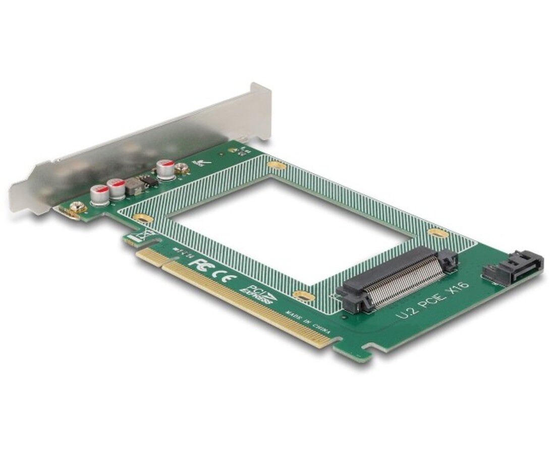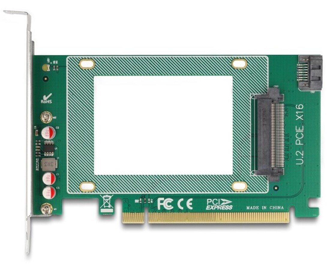 Karta PCI Express marki Delock rozbudowuje komputer osobisty o jedno złącze U.2, umożliwiając podłączenie dysków U.2 SSD 2,5". Dodatkowo możliwe jest korzystanie z napędów SSD/HDD 2,5" poprzez port SATA na płycie głównej.