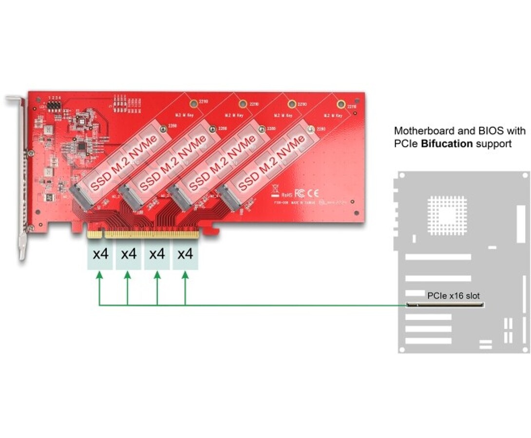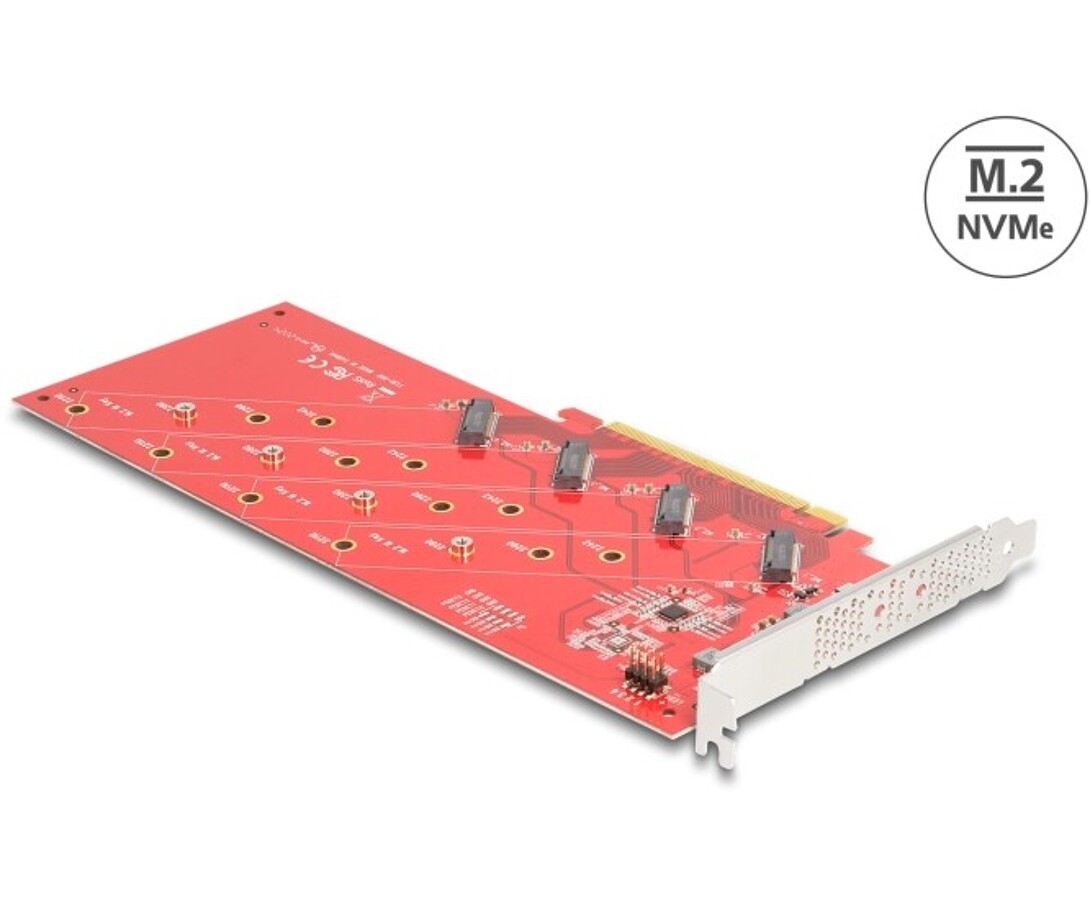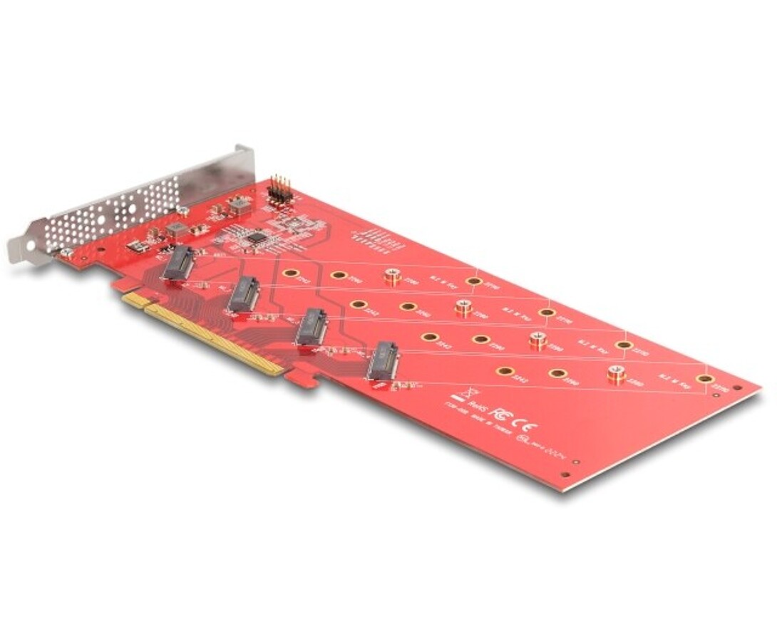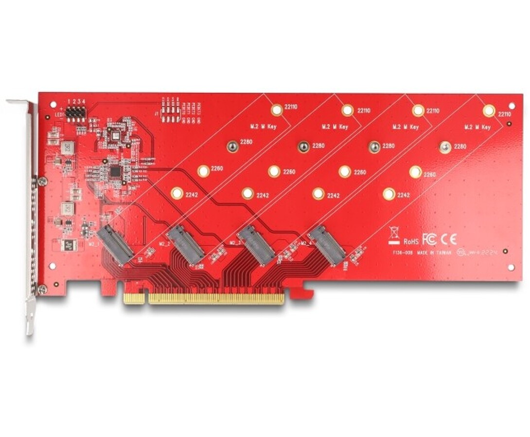 Karta PCI Express marki Delock rozszerza komputer osobisty o cztery gniazda M.2, umożliwiając podłączenie modułów M.2 SSD w formatach 22110, 2280, 2260 oraz 2242. Wymaga rozszczepienia PCIe na płycie głównej, aby rozdzielić sygnał i używać portów powielonych.