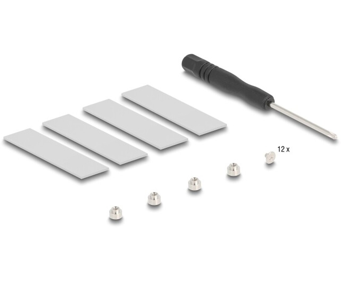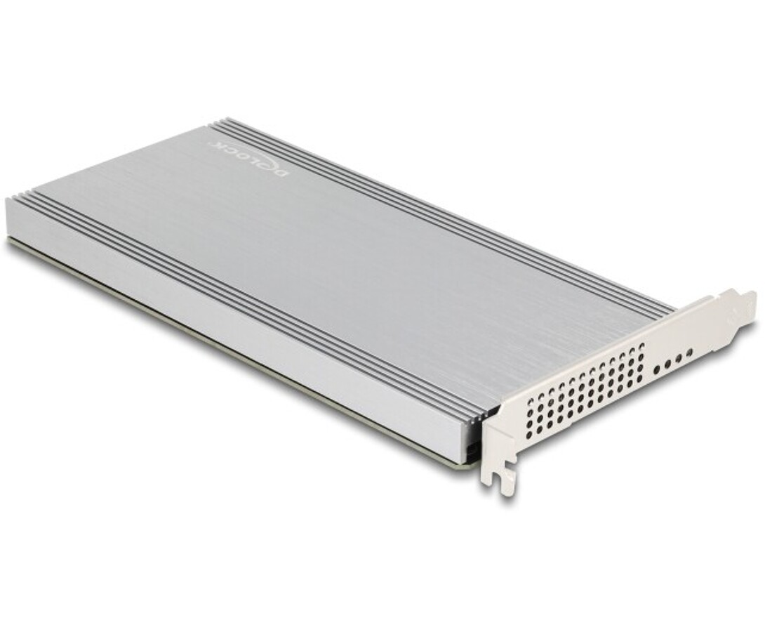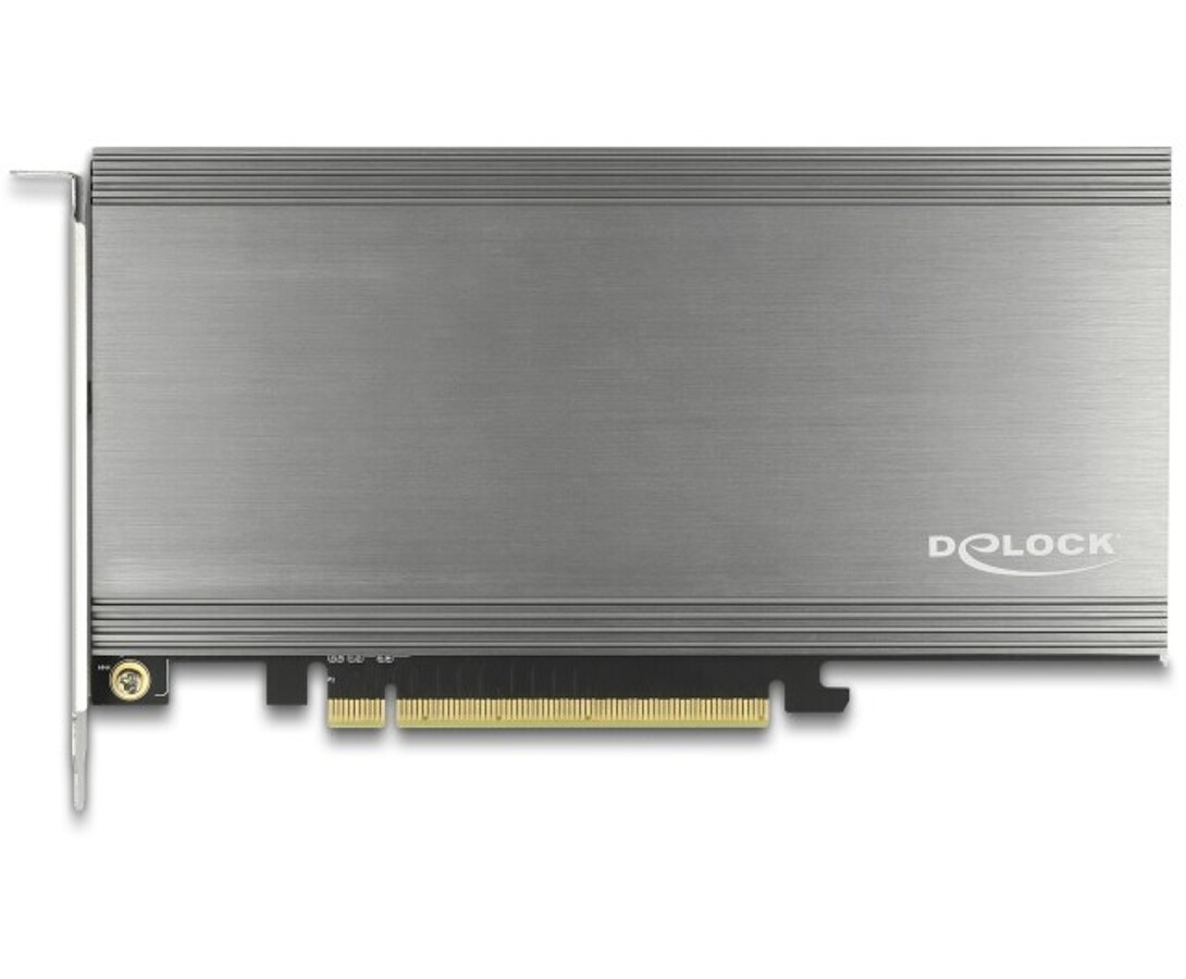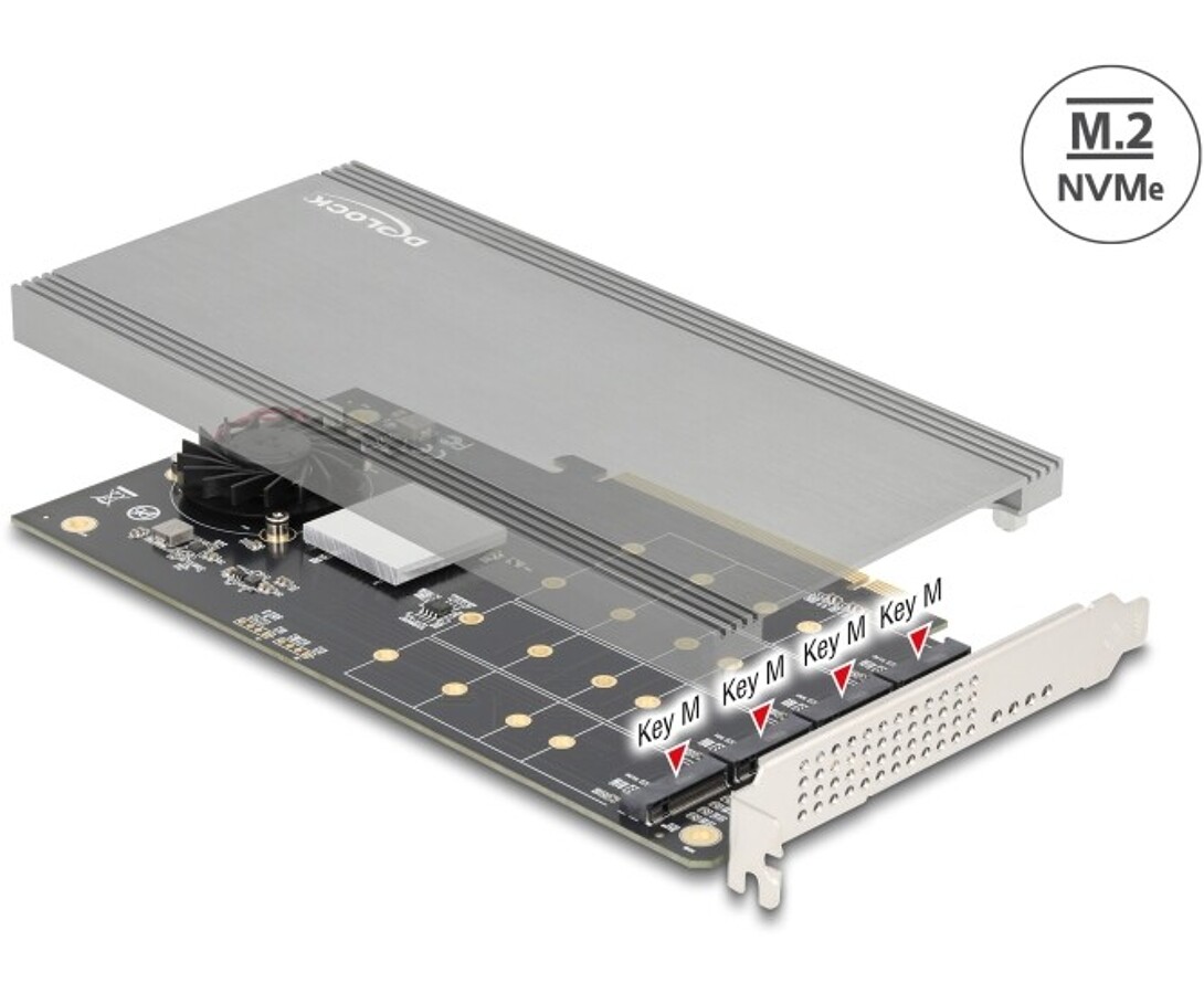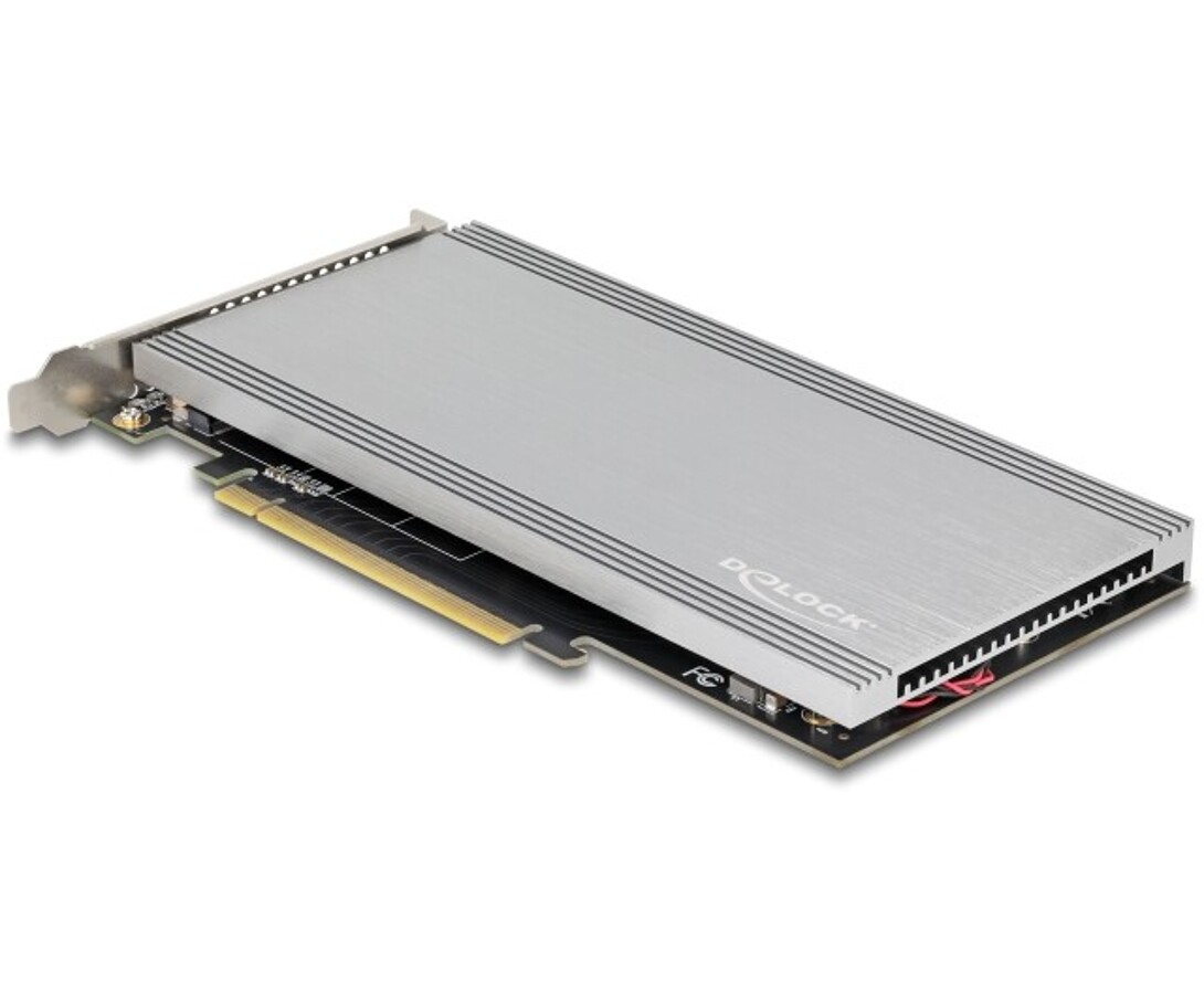 Karta PCI Express marki Delock rozbudowuje komputer osobisty o cztery gniazda M.2, umożliwiając podłączenie do czterech M.2 SSD w formatach 2280, 2260, 2242 oraz 2230. Dzięki dużemu odbiornikowi ciepła i wentylatorowi na płycie karta zapewnia efektywne chłodzenie modułów M.2, co sprawdza się w zastosowaniach gamingowych i serwerowych, umożliwiając jednoczesne wykorzystanie wszystkich slotów NVMe.
