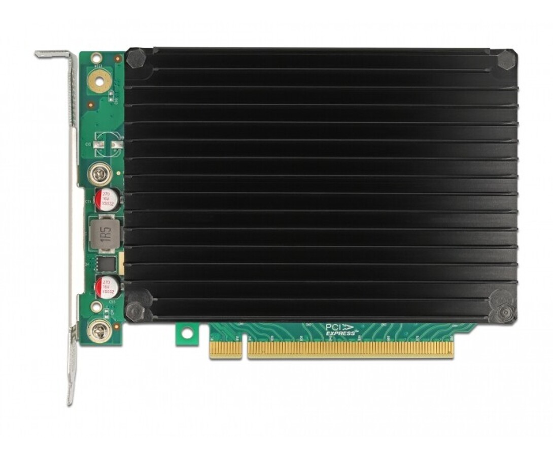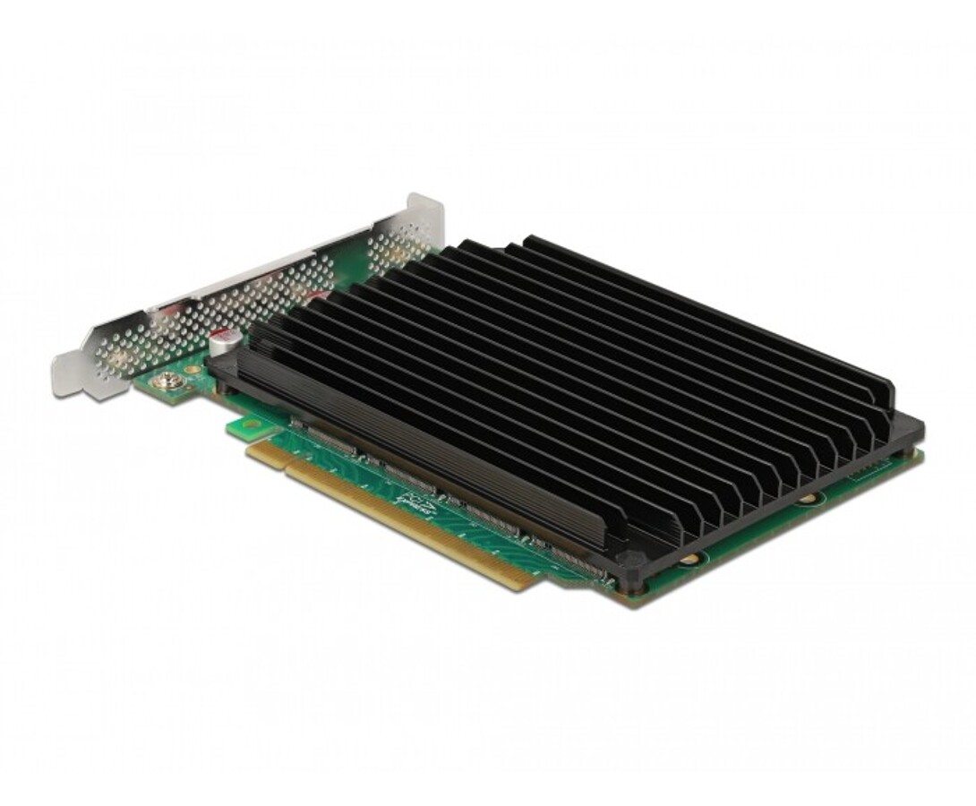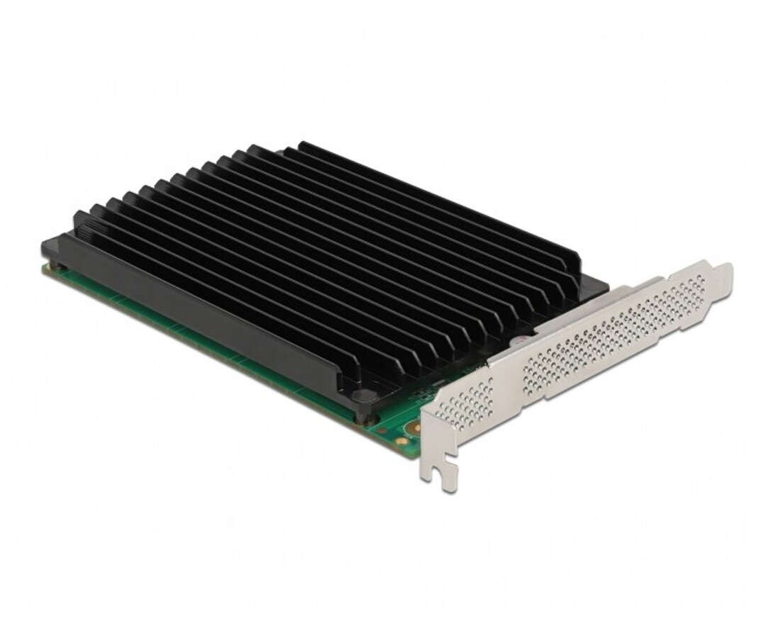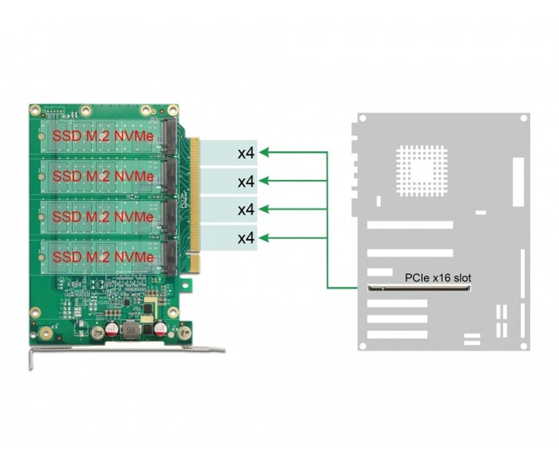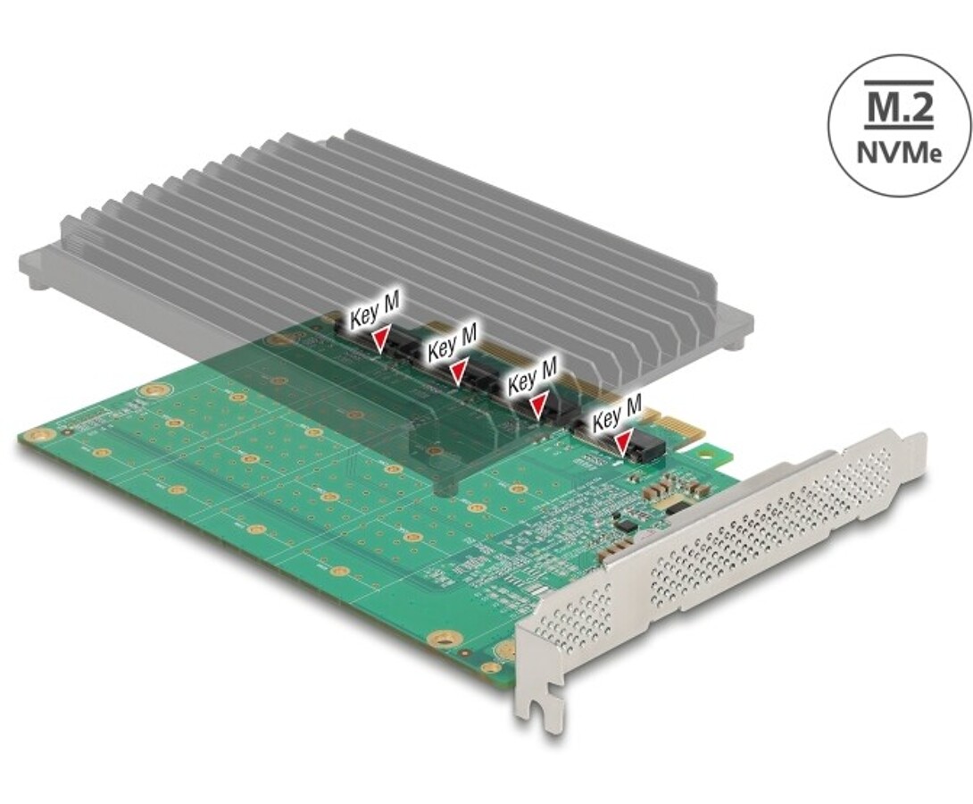 Karta PCI Express marki Delock rozbudowuje komputer osobisty o cztery gniazda M.2, umożliwiając podłączenie do czterech M.2 SSD w formatach 2280, 2260, 2242 oraz 2230. Dzięki dużemu odbiornikowi ciepła na płycie zapewnione jest odpowiednie chłodzenie modułów M.2. Karta wymaga rozszczepienia PCIe na płycie głównej, aby rozdzielić sygnał PCIe i używać wszystkich portów powielonych. Bez rozszczepienia dostępny jest jedynie pojedynczy port M.2.