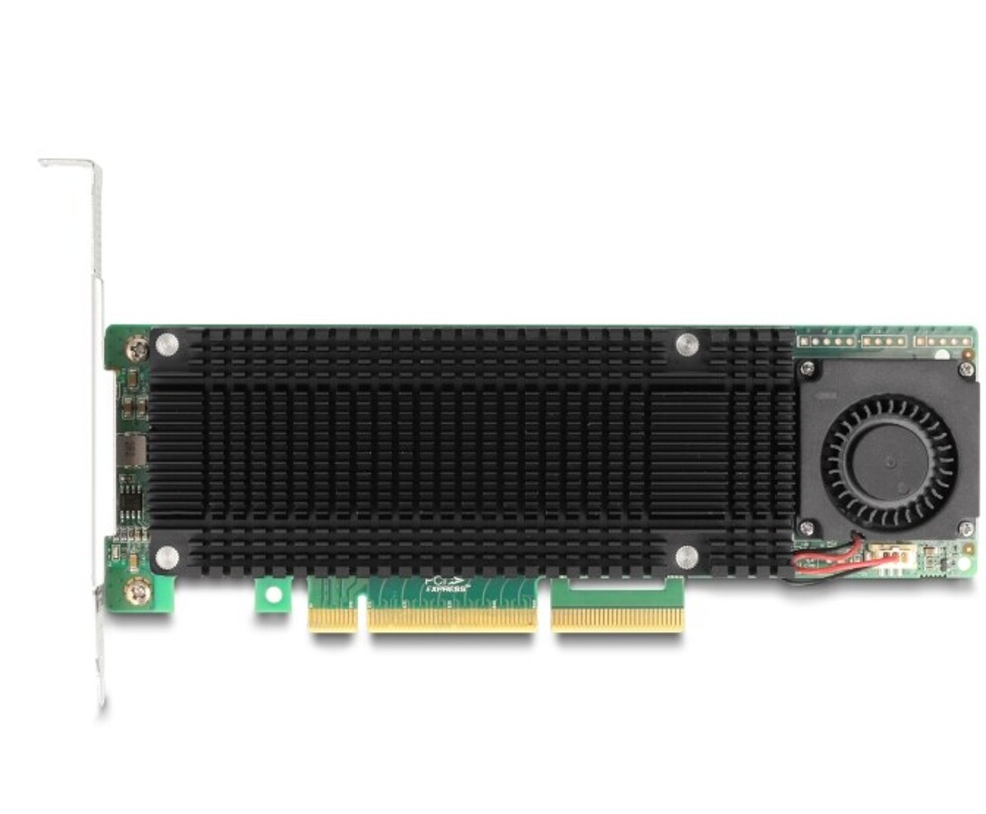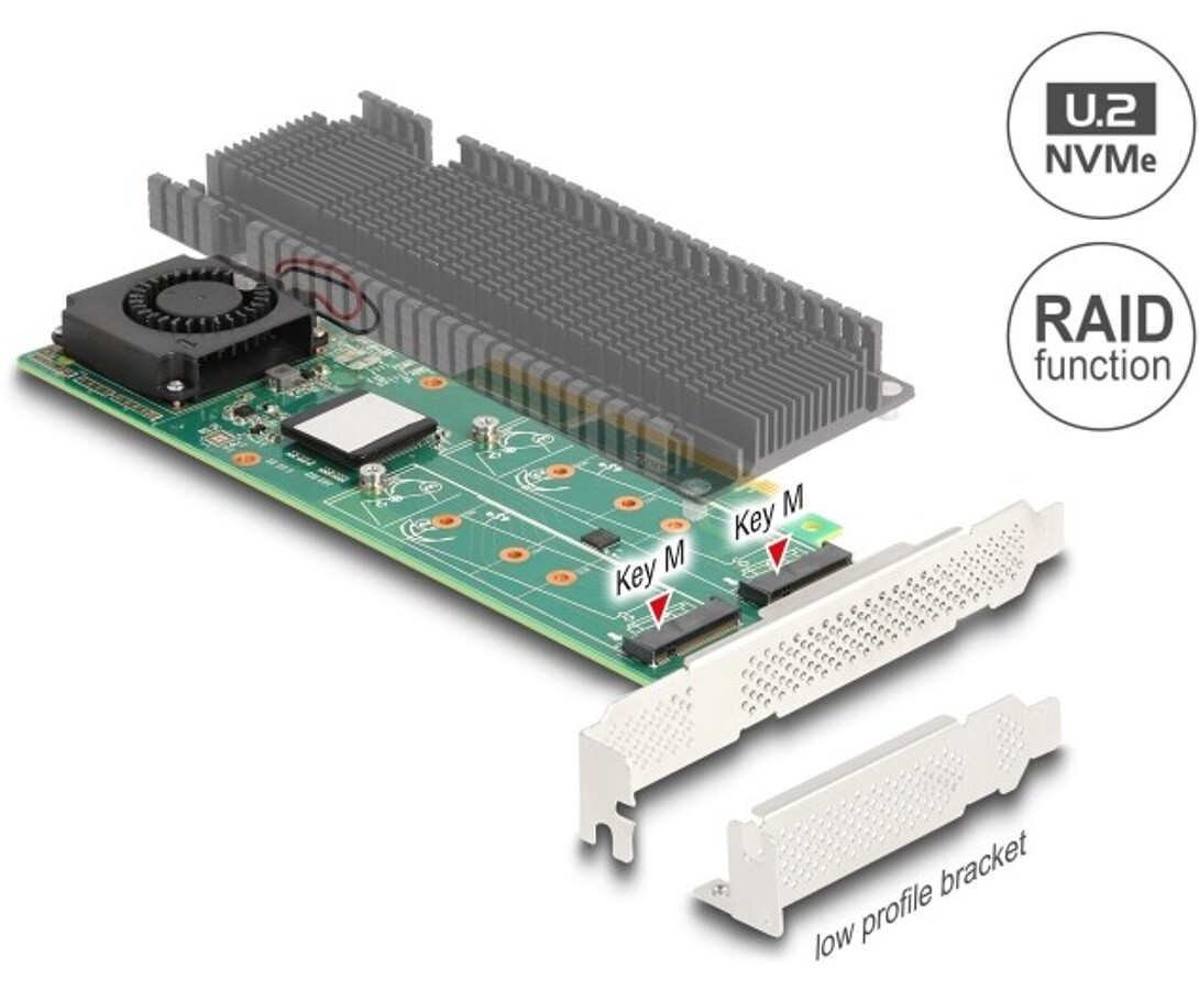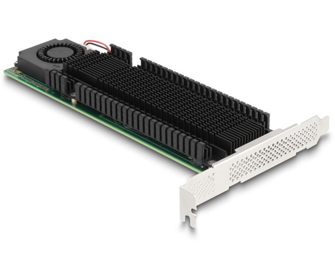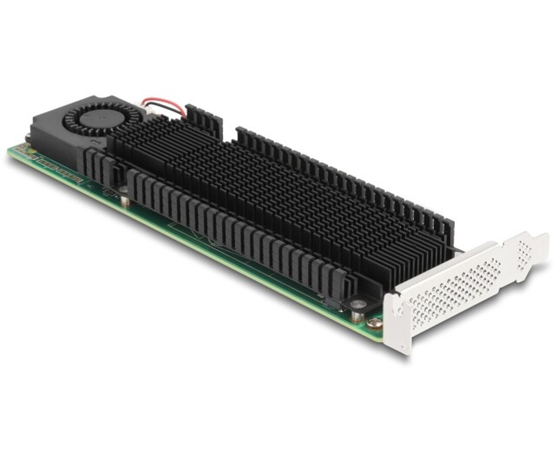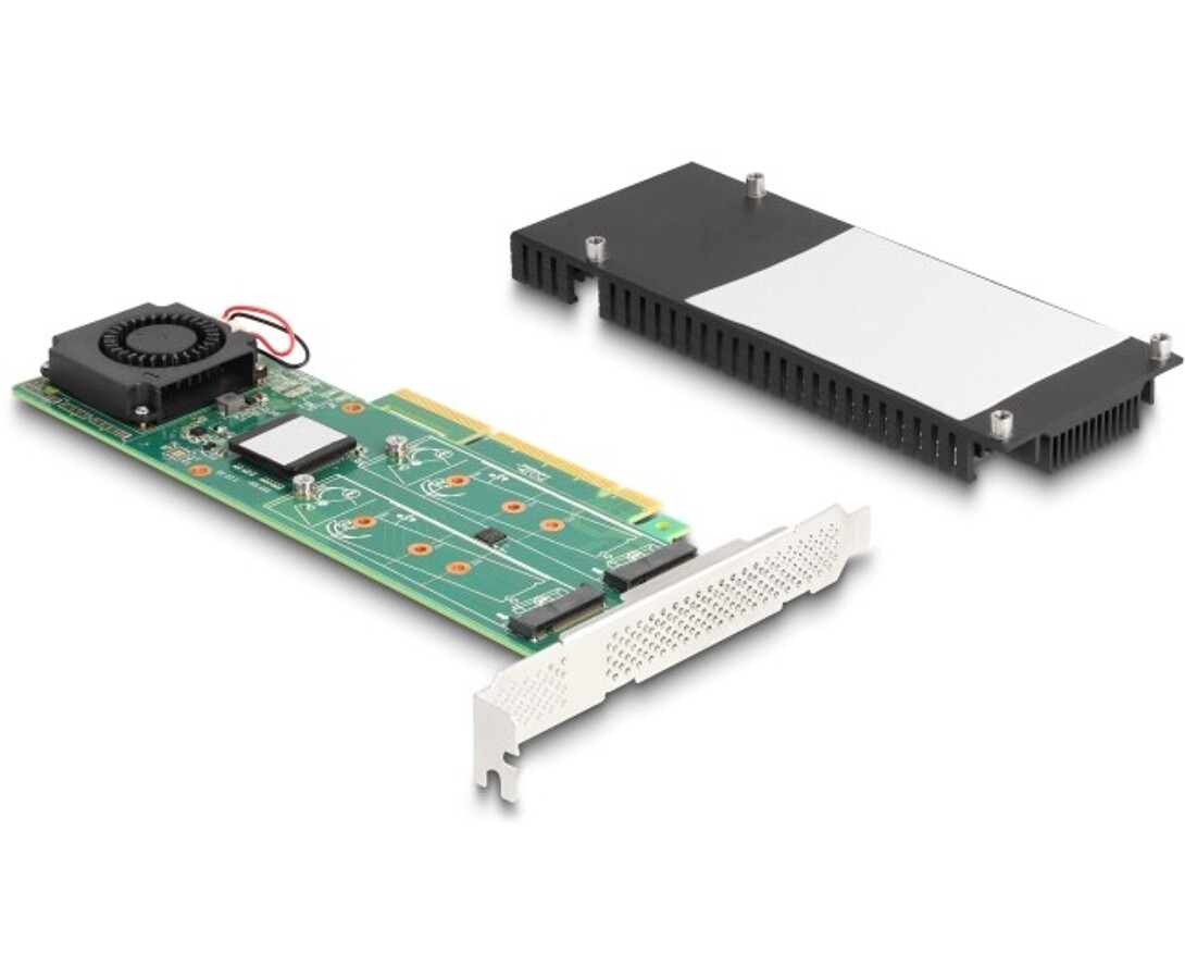 Karta PCI Express marki Delock rozbudowuje komputer osobisty o dwa gniazda M.2, umożliwiając podłączenie do dwóch M.2 SSD w formatach 2280, 2260, 2242 oraz 2230. Dzięki dużemu odbiornikowi ciepła i wentylatorowi na płycie zapewnione jest efektywne chłodzenie modułów M.2. Przy użyciu więcej niż jednego portu M.2 możliwe jest stosowanie różnych trybów RAID.