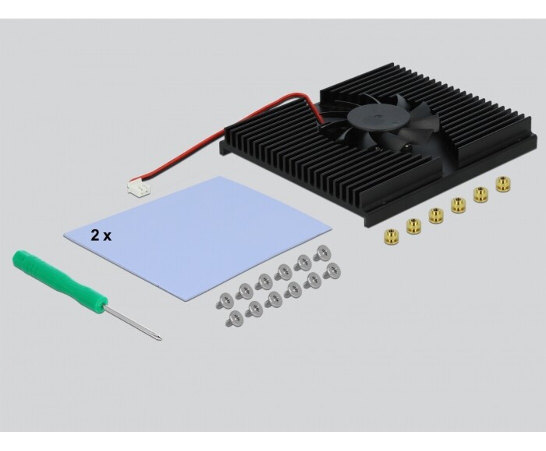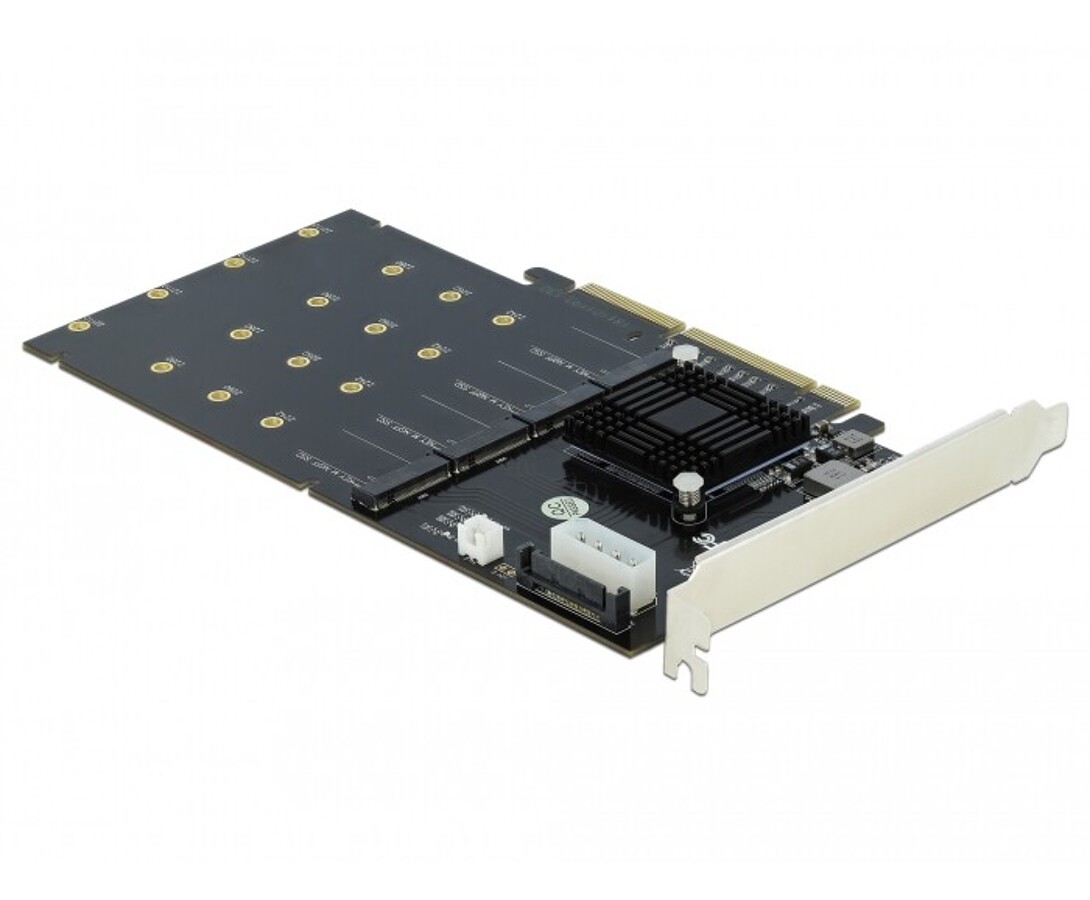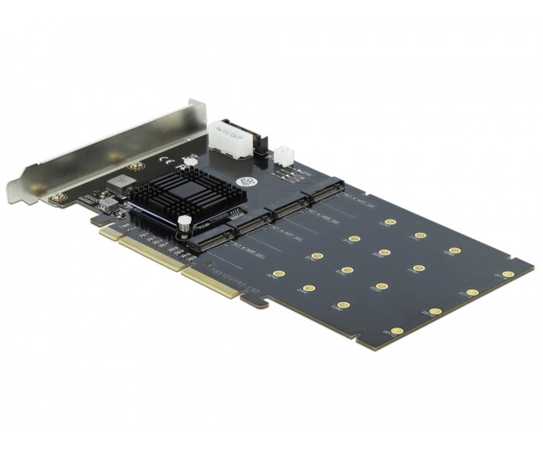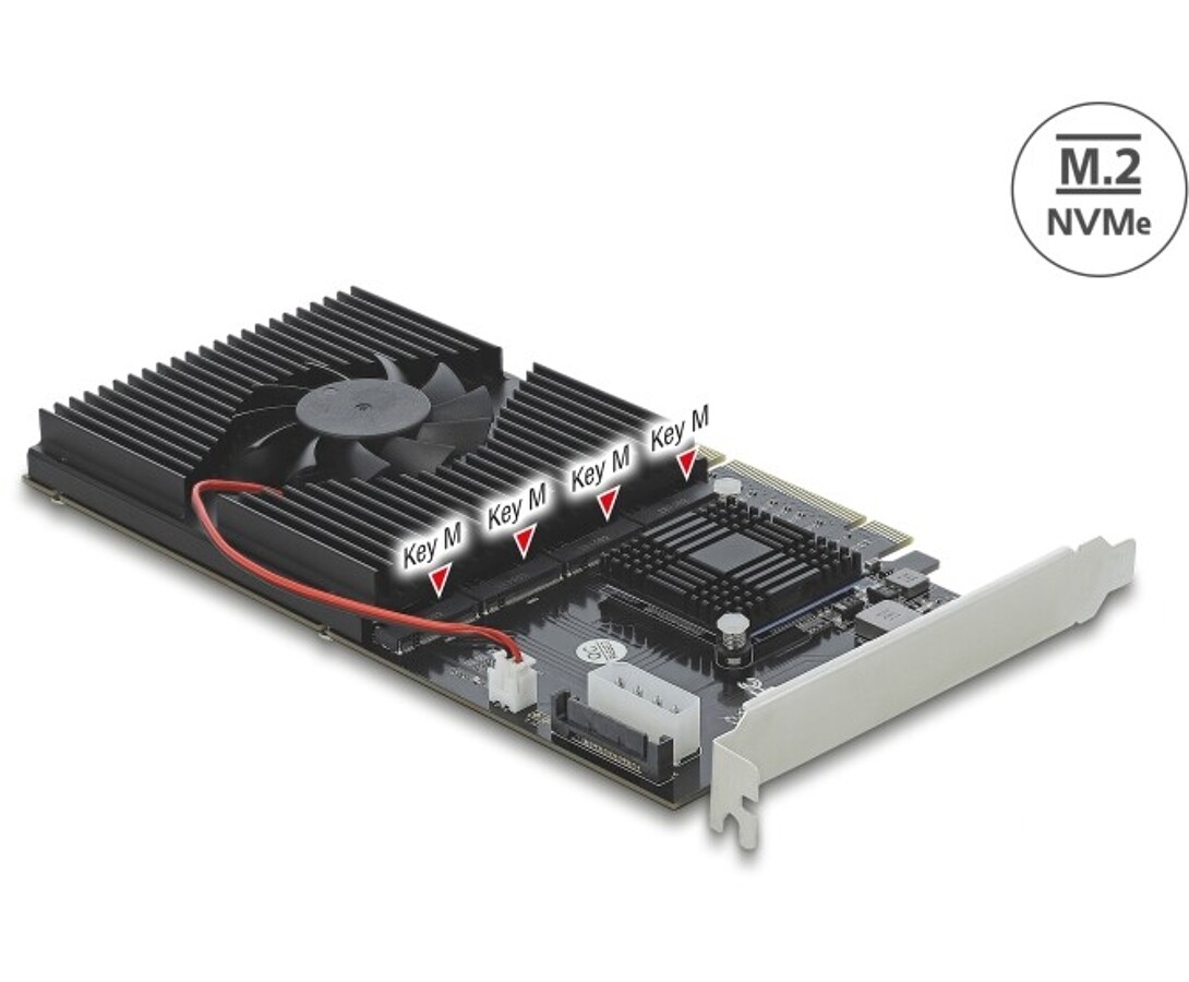 Karta PCI Express marki Delock rozbudowuje komputer osobisty o cztery gniazda M.2, umożliwiając podłączenie do czterech M.2 SSD w formatach 22110, 2280, 2260 oraz 2242. Duży odbiornik ciepła oraz wentylator na płycie zapewniają odpowiednie chłodzenie wszystkich modułów, co pozwala na jednoczesne wykorzystanie wszystkich slotów.