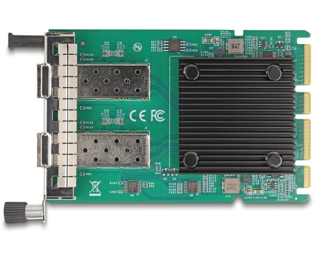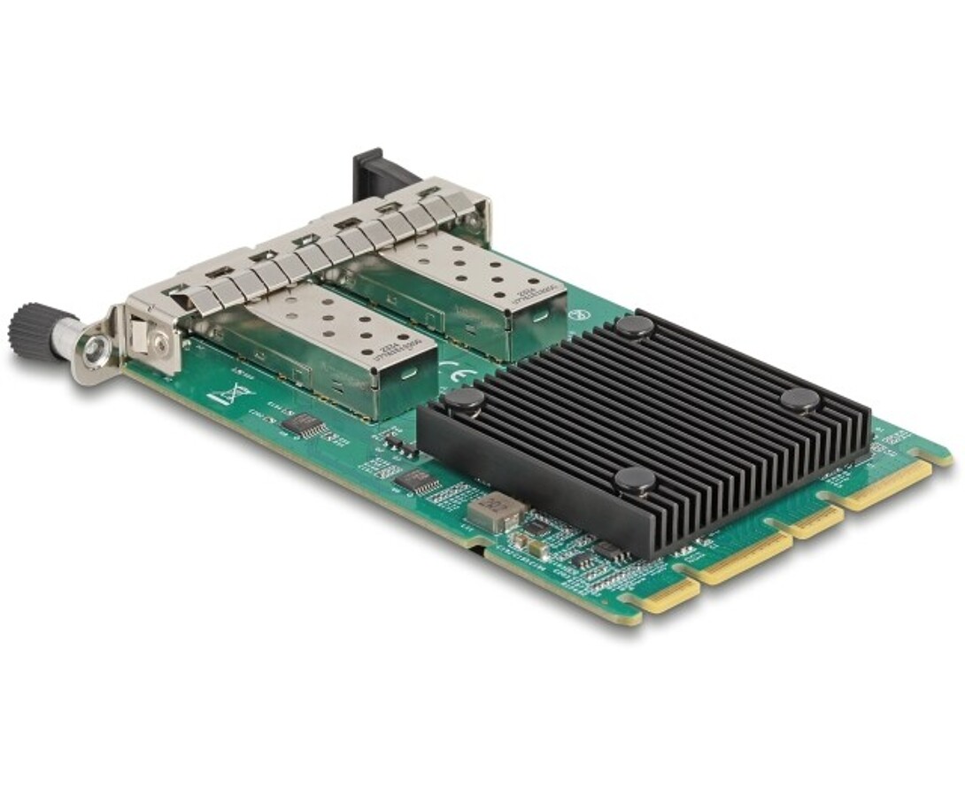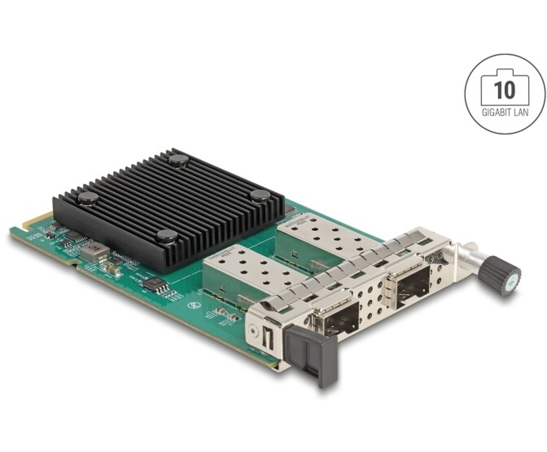 Karta OCP 3.0 marki Delock umożliwia podłączenie serwera do sieci poprzez dwa porty SFP+ z prędkością transmisji danych do 10 Gbps, wspierając standardy 10 Gigabit Ethernet i PCI Express x8. Konstrukcja w formacie SFF zgodna ze standardem Open Compute Project ułatwia konserwację i serwisowanie bez konieczności otwierania obudowy, a funkcje agregacji łączy, VLAN oraz obsługa ramek Jumbo 9k zapewniają wydajną i niezawodną pracę w centrach danych.