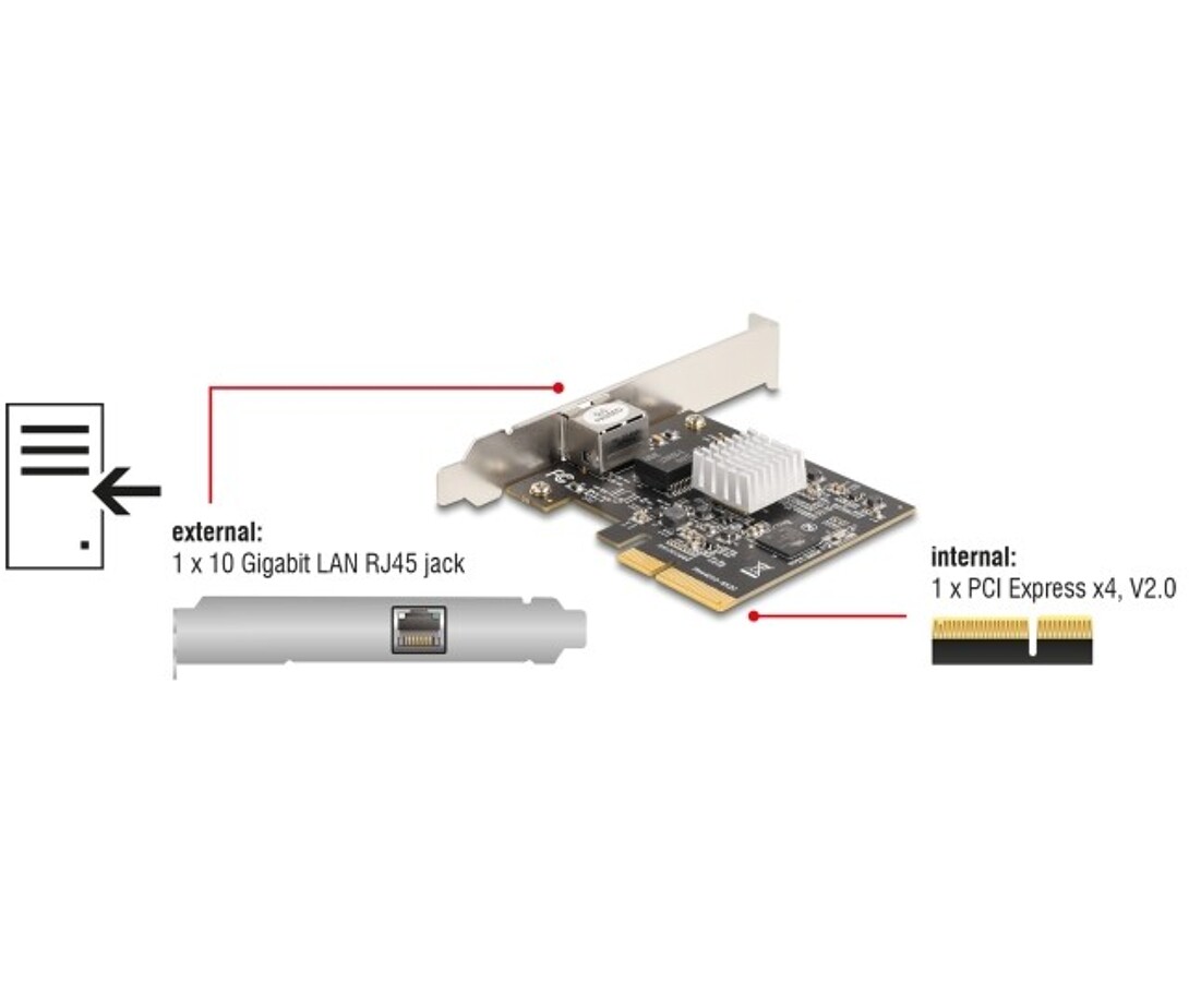 Karta PCI Express marki Delock oferuje port sieciowy z maksymalną prędkością transmisji danych do 10 Gbps przy użyciu standardowych przewodów miedzianych Cat. 6 lub Cat. 6A. Dzięki technologii NBASE-T dostępne są dodatkowe prędkości 2,5 Gbps i 5 Gbps, umożliwiające wyższą przepustowość niż 1 Gbps przy braku możliwości połączenia 10 Gbps. Karta obsługuje ramki Jumbo 9k, VLAN oraz agregację łączy zgodnie z IEEE 802.3ad, co zapewnia wysoką wydajność i niezawodność w sieciach serwerowych i biurowych.