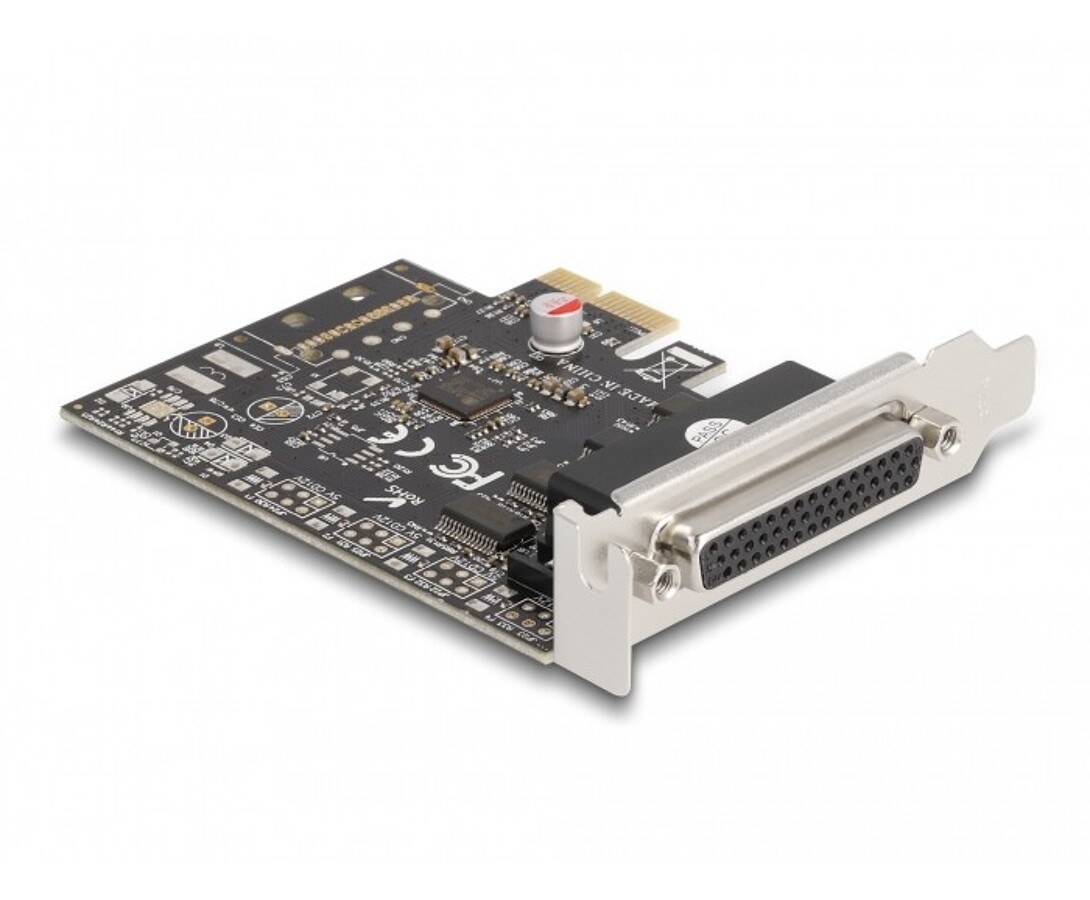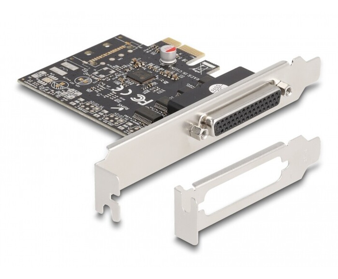 Karta PCI Express marki Delock rozszerza komputer o dwa porty RS-232 oraz jeden port równoległy DB25, umożliwiając podłączenie urządzeń przemysłowych, drukarek, skanerów i konwerterów. Chipset WCH CH384L zapewnia stabilną komunikację i obsługę szybkich trybów LPT, a dołączony uchwyt niskoprofilowy pozwala na instalację w komputerach Mini PC.