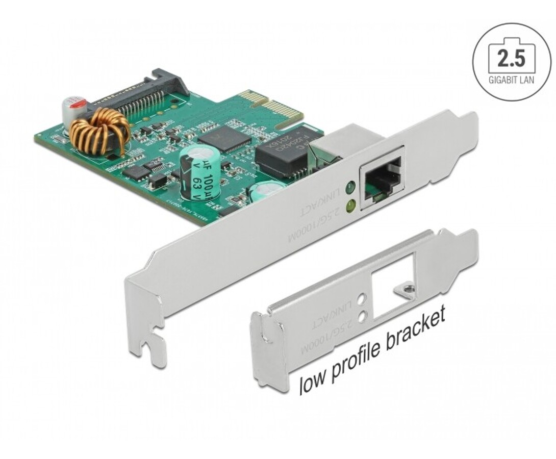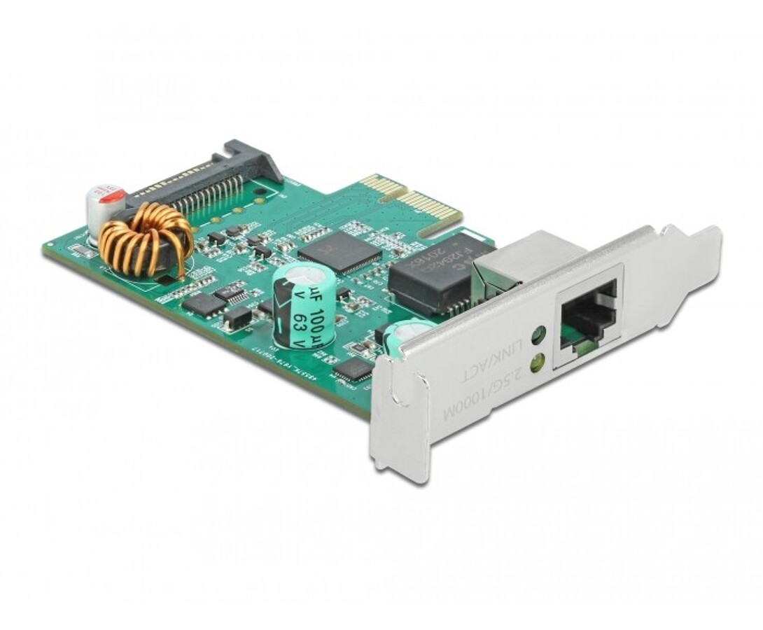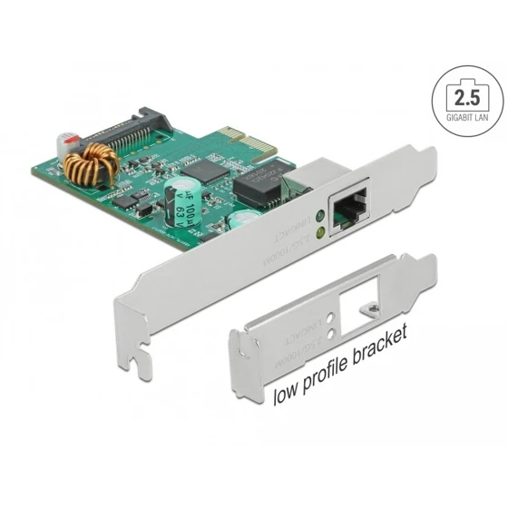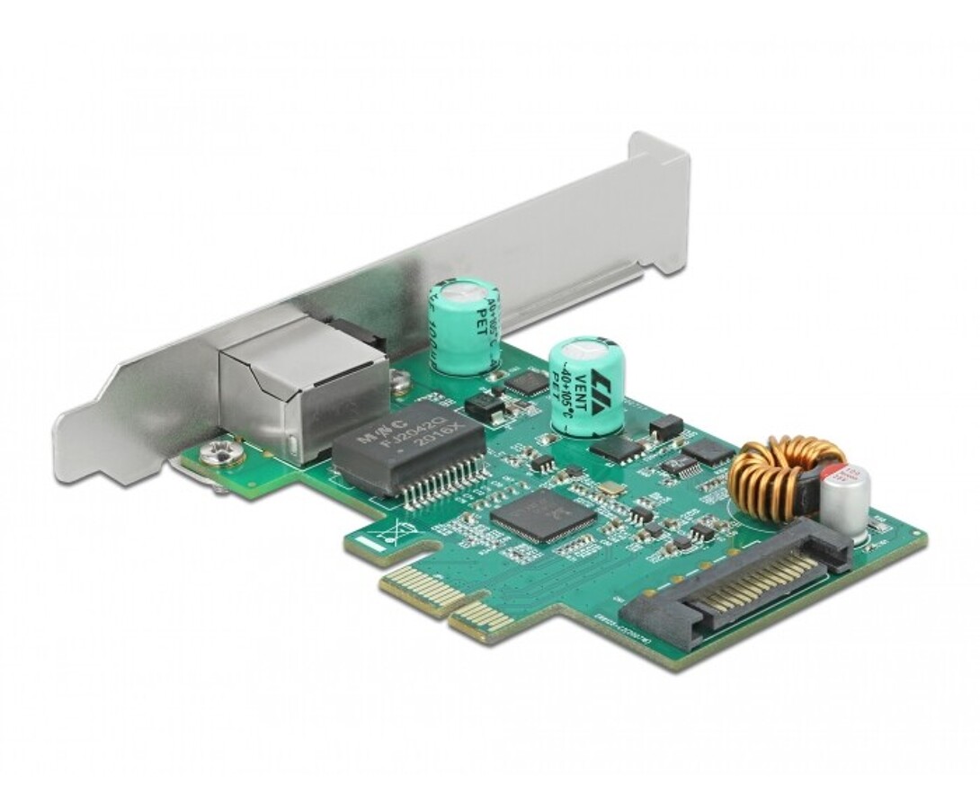 Karta PCI Express marki Delock oferuje port sieciowy z prędkością transmisji danych do 2,5 Gbps, obsługując technologię NBASE-T, która automatycznie wybiera prędkość od 1 Gbps do 2,5 Gbps na standardowym okablowaniu. Karta wspiera zasilanie PoE i PoE+ zgodnie z IEEE 802.3af/at, umożliwiając zasilanie urządzeń sieciowych, takich jak kamery IP lub rozgałęziacze PoE, oraz obsługuje funkcję Wake On LAN (WOL), kodowanie priorytetu warstwy 2, VLAN, pełną kontrolę podwójnego przepływu danych oraz ramki Jumbo 16k.