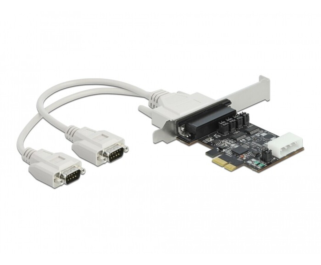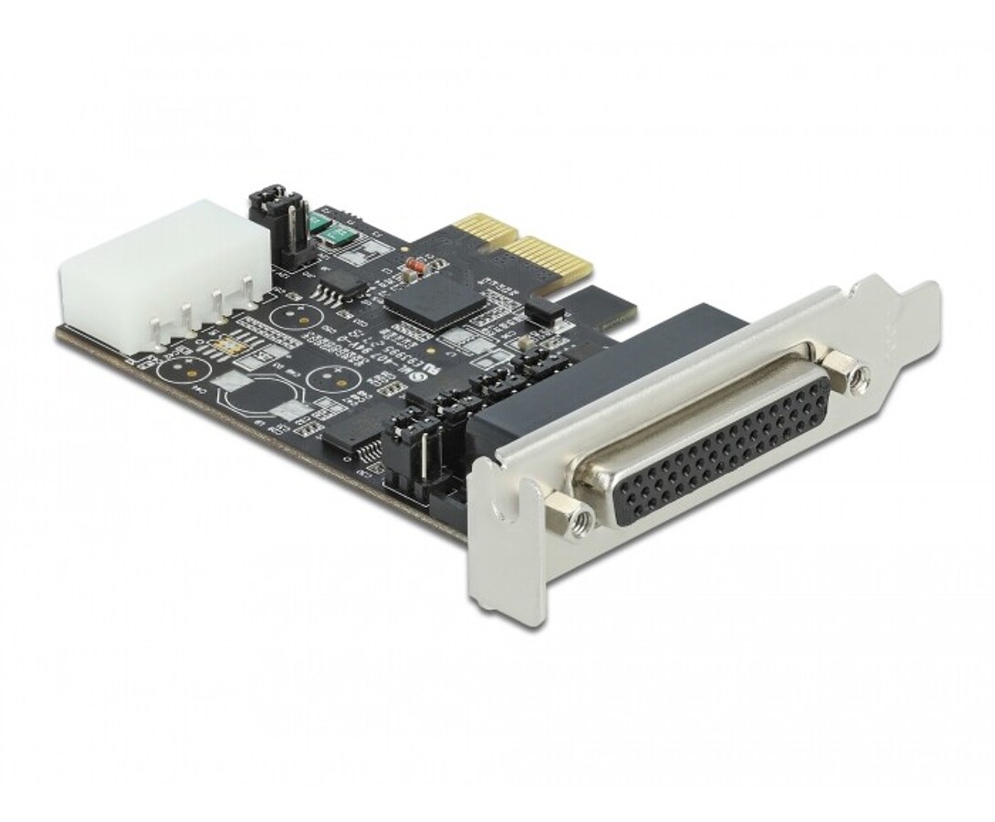 Karta PCI Express marki Delock rozszerza komputer o dwa porty RS-232 oraz jeden port równoległy DB25, umożliwiając podłączenie urządzeń takich jak drukarki, skanery czy sterowniki przemysłowe. Chipset ASIX AX99100 zapewnia stabilną komunikację i wysoką kompatybilność z interfejsem 16C950 UART, a niski profil umożliwia montaż w komputerach Mini PC.