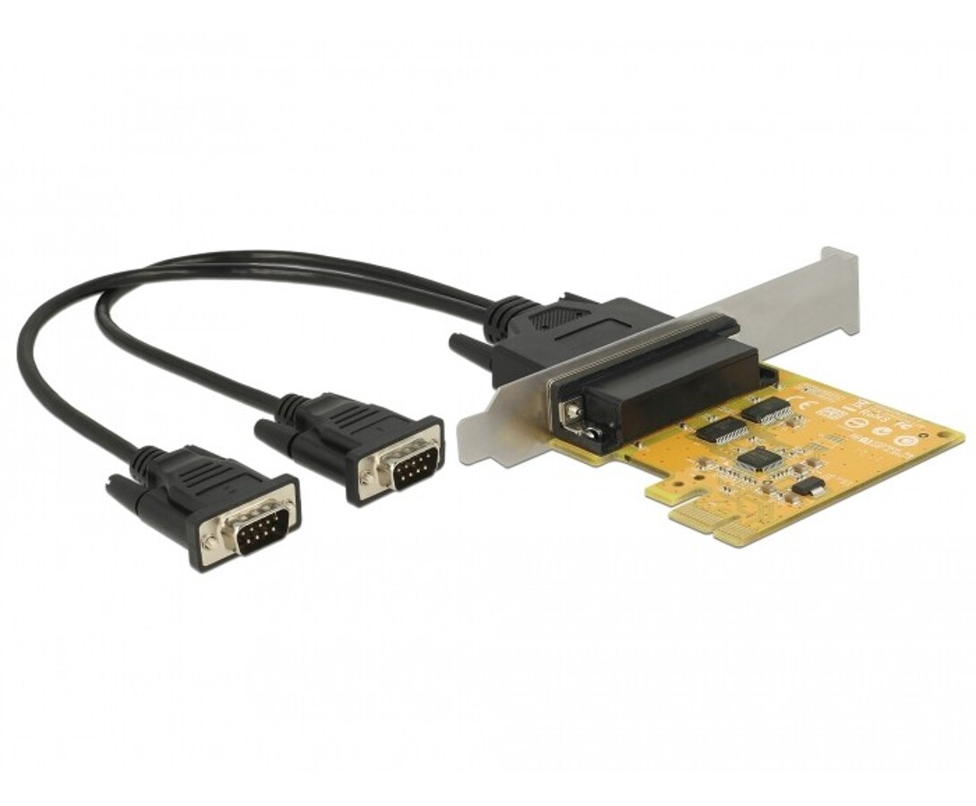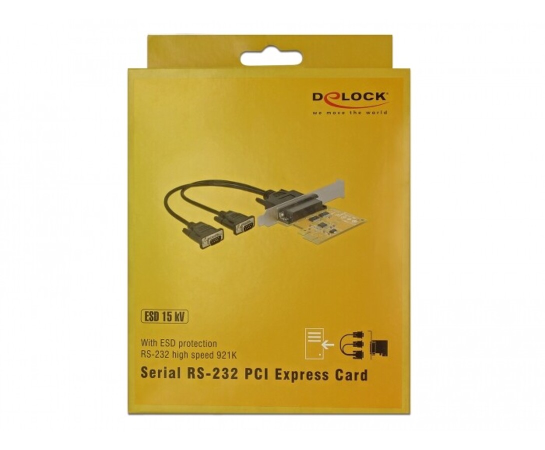 Karta PCI Express marki Delock rozszerza komputer PC o dwa zewnętrzne porty szeregowe RS-232 o dużej prędkości, umożliwiając podłączanie różnych urządzeń, takich jak bramy, plotery, drukarki, przedłużacze linii, keye, moduły wbudowane, programowalne tablice bram (FPGA) czy kontrolery. Dzięki dołączonym śrubkom skrzydełkowym każde urządzenie szeregowe może być podłączane zarówno za pomocą śrub, jak i nakrętek. Niskoprofilowy uchwyt pozwala na instalację karty również w komputerach Mini PC.