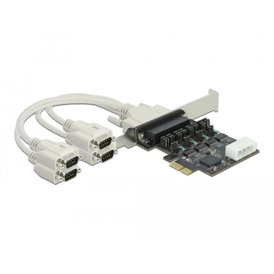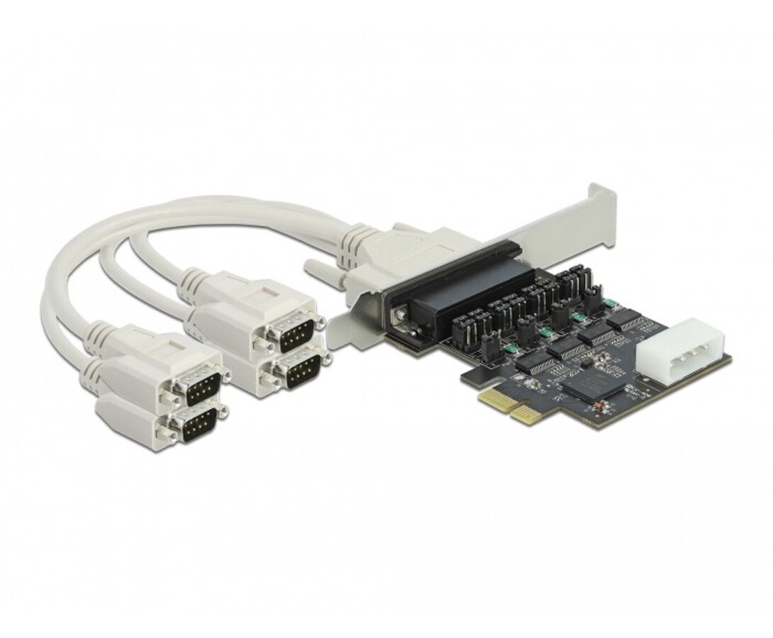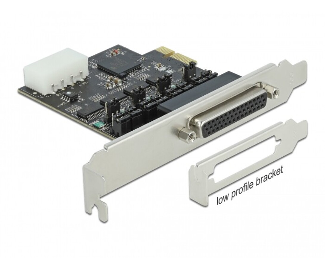 Karta PCI Express marki Delock umożliwia rozbudowę komputera osobistego o cztery zewnętrzne porty szeregowe RS-232, pozwalając na jednoczesne podłączenie wielu urządzeń, takich jak skanery, systemy automatyki, urządzenia pomiarowe czy kontrolery przemysłowe. Karta oferuje opcjonalne zasilanie poprzez interfejs RS-232 z możliwością wyboru napięcia 5V lub 12 V, ustawianego indywidualnie dla każdego portu za pomocą zworek. Dzięki dołączonemu uchwytowi niskoprofilowemu może być instalowana również w komputerach Mini PC. Chipset MaxLinear 17V354 zapewnia stabilną transmisję danych i pełną kompatybilność z interfejsem 16C550 UART, a ochrona ESD ±15 kV chroni sygnały przed uszkodzeniami elektrostatycznymi.