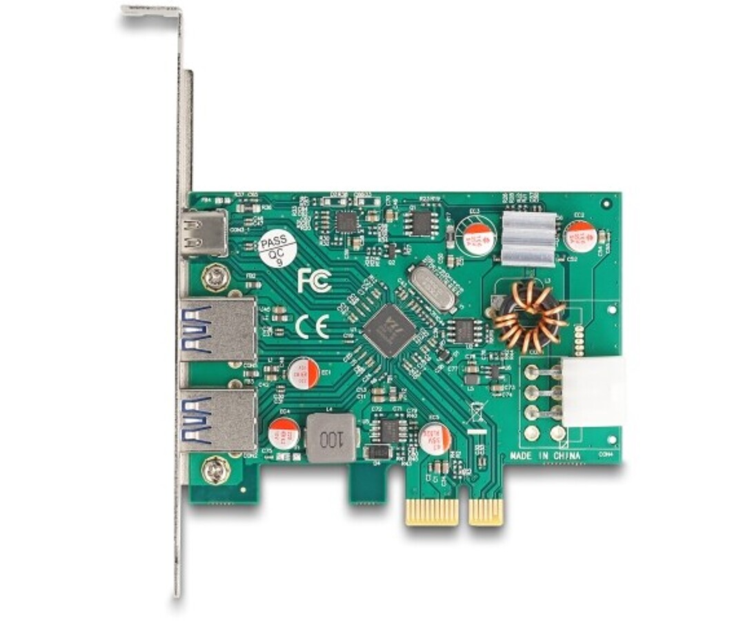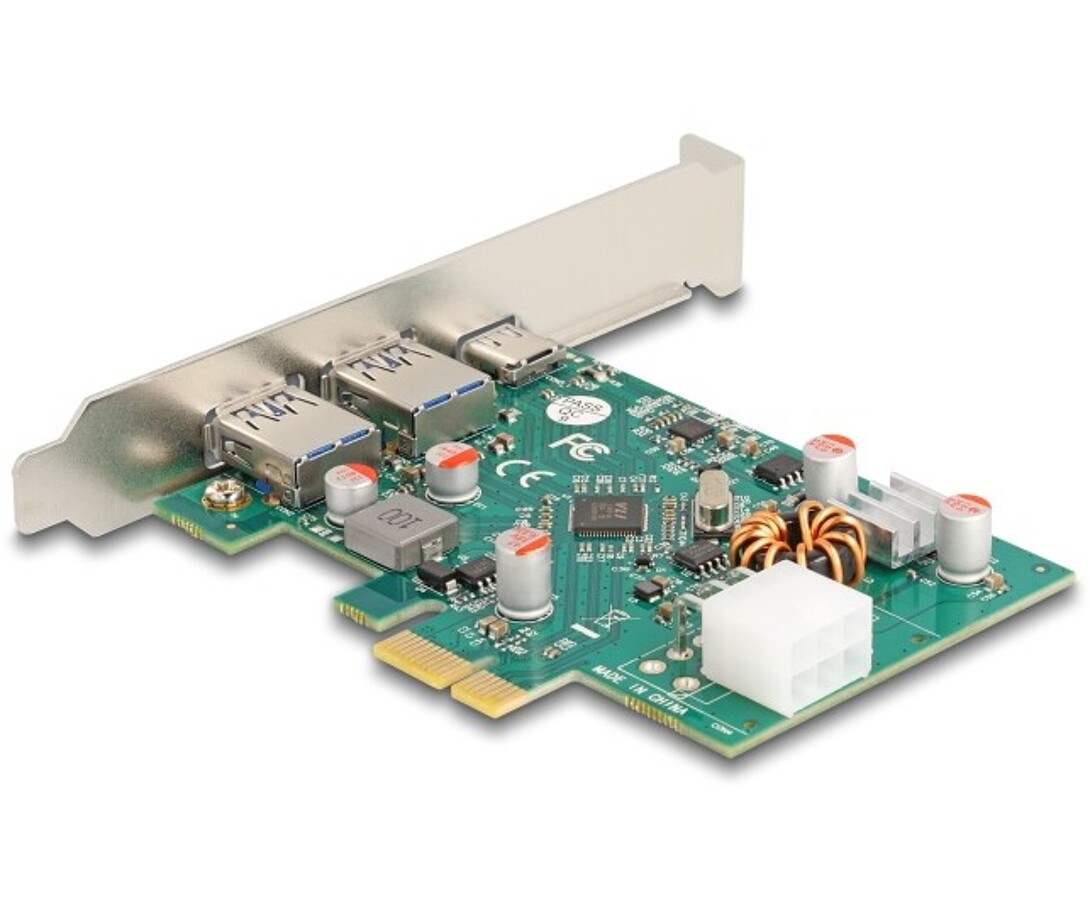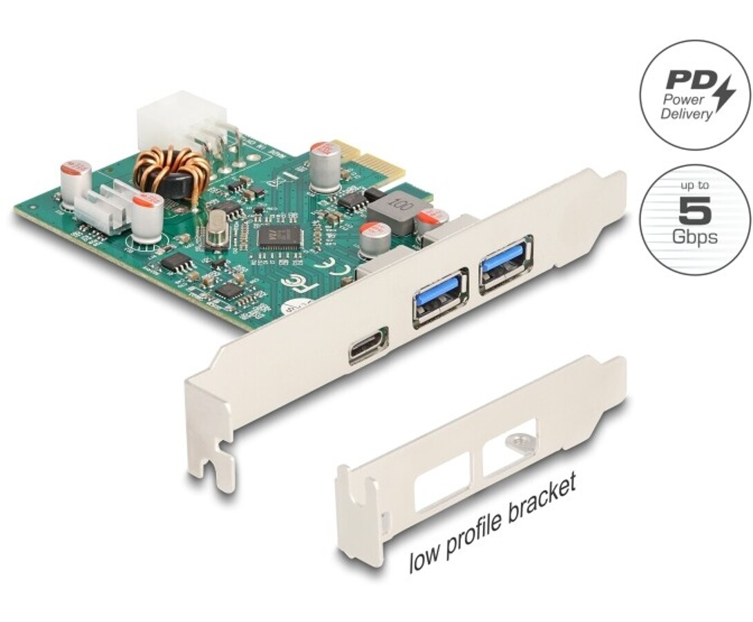 Karta PCI Express marki Delock umożliwia rozbudowę komputera o trzy zewnętrzne porty USB 5 Gbps – dwa porty Typu-A oraz jeden port USB typu C z obsługą funkcji Power Delivery. Dzięki temu możliwe jest jednoczesne podłączanie urządzeń peryferyjnych, takich jak pamięci flash, czytniki kart, obudowy zewnętrzne czy stacje dokujące, a także ładowanie urządzeń mobilnych, w tym smartfonów, tabletów i laptopów. Chipset VIA VL805 zapewnia wysoką stabilność działania oraz szybki transfer danych. Zasilanie dostarczane jest przez 6-pinowe złącze, co umożliwia obsługę urządzeń o większym zapotrzebowaniu na energię.