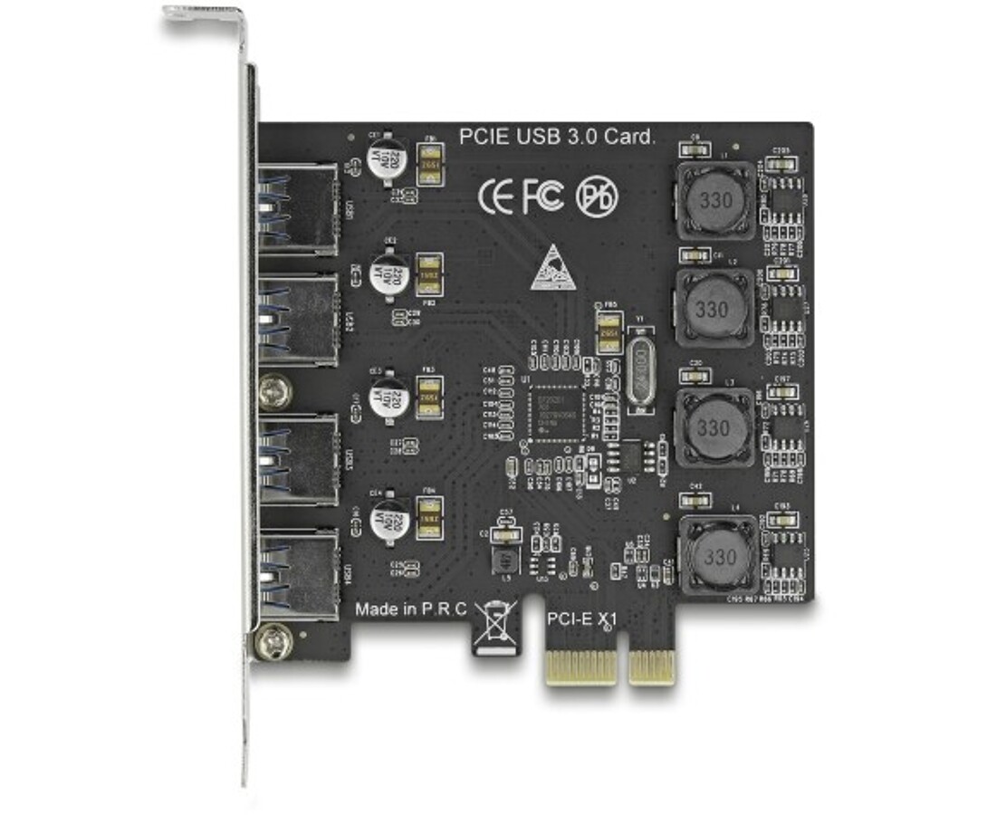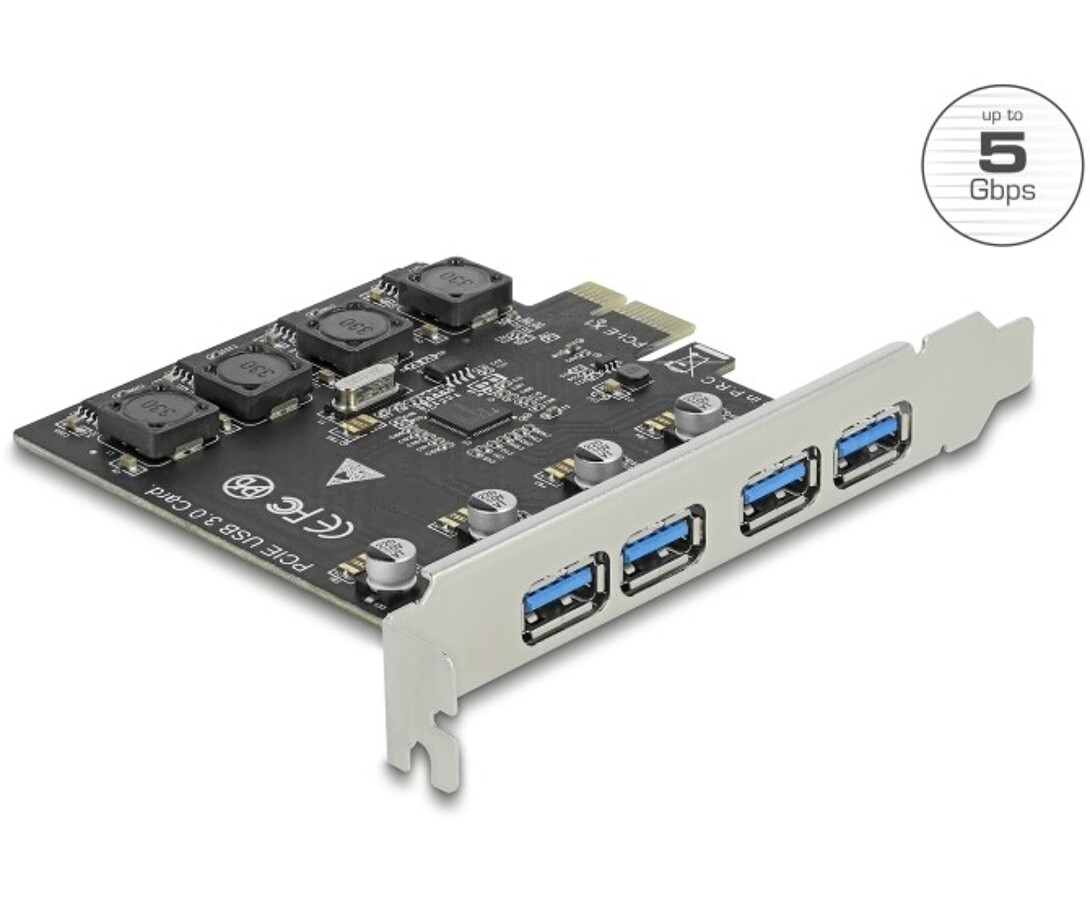 Karta PCI Express marki Delock rozbudowuje komputer osobisty o cztery porty USB 5 Gbps. Umożliwia podłączenie różnych urządzeń USB, takich jak stacje dokujące, czytniki kart, obudowy zewnętrzne i inne. Karta nie wymaga dodatkowego zasilania, a każdy port dostarcza do 2 A, co daje łącznie 8 A na wszystkich portach.