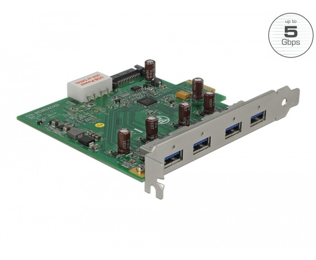 Karta PCI Express marki Delock dodaje do komputera cztery porty USB 5 Gbps, umożliwiając szybkie podłączanie urządzeń takich jak stacje dokujące, czytniki kart czy obudowy zewnętrzne. Dzięki chipsetowi Renesas D720201 oferuje stabilny transfer danych i wydajne zasilanie do 2 A na port bez potrzeby dodatkowego zasilania.