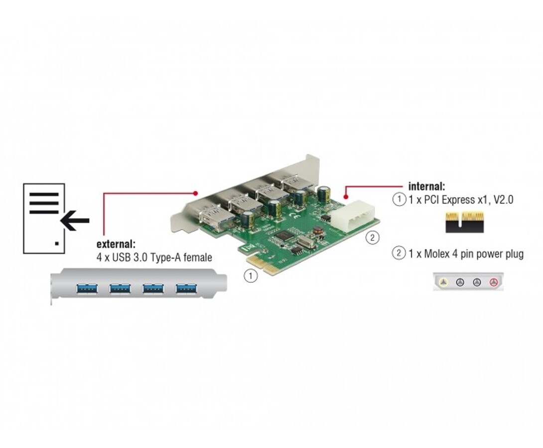 Karta PCI Express marki Delock dodaje do komputera cztery porty USB 5 Gbps, umożliwiając szybkie podłączanie urządzeń takich jak stacje dokujące, czytniki kart czy obudowy zewnętrzne. Dzięki chipsetowi Renesas D720201 oferuje stabilny transfer danych i wydajne zasilanie do 2 A na port bez potrzeby dodatkowego zasilania.