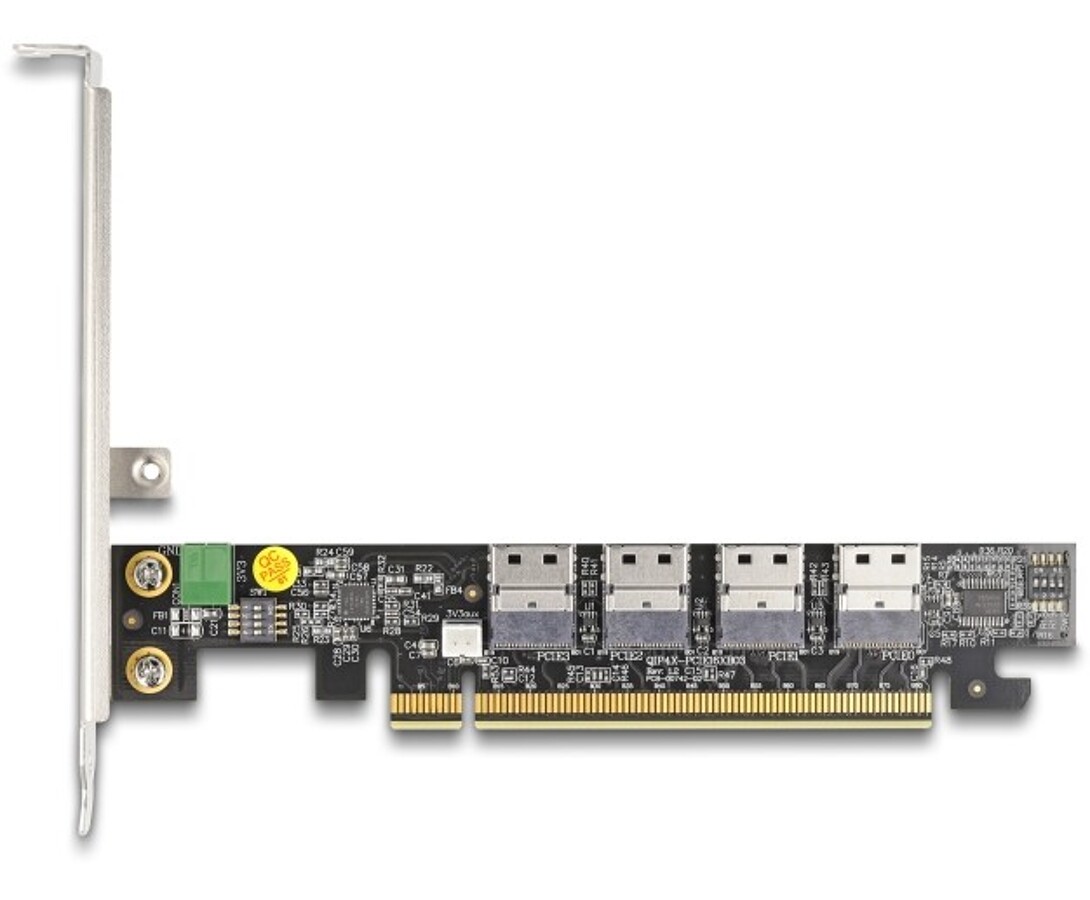 Karta PCI Express marki Delock umożliwia rozszerzenie komputera PC o cztery interfejsy SFF-8654, które pozwalają na podłączenie dysków SSD NVMe z interfejsem U.2 przy użyciu opcjonalnych kabli. Dzięki obsłudze standardu PCI Express 5.0 x16 zapewnia wyjątkowo wysoką przepustowość i stabilność transmisji danych. Karta wykorzystuje protokół NVMe, co gwarantuje szybki dostęp do pamięci masowej i pełne wsparcie funkcji bootowania systemu. Do prawidłowego działania wszystkich czterech portów wymagane jest rozszczepienie sygnału PCIe (bifurcation) na płycie głównej. Produkt stanowi profesjonalne rozwiązanie dla systemów serwerowych, przemysłowych i stacji roboczych o dużych wymaganiach wydajnościowych.