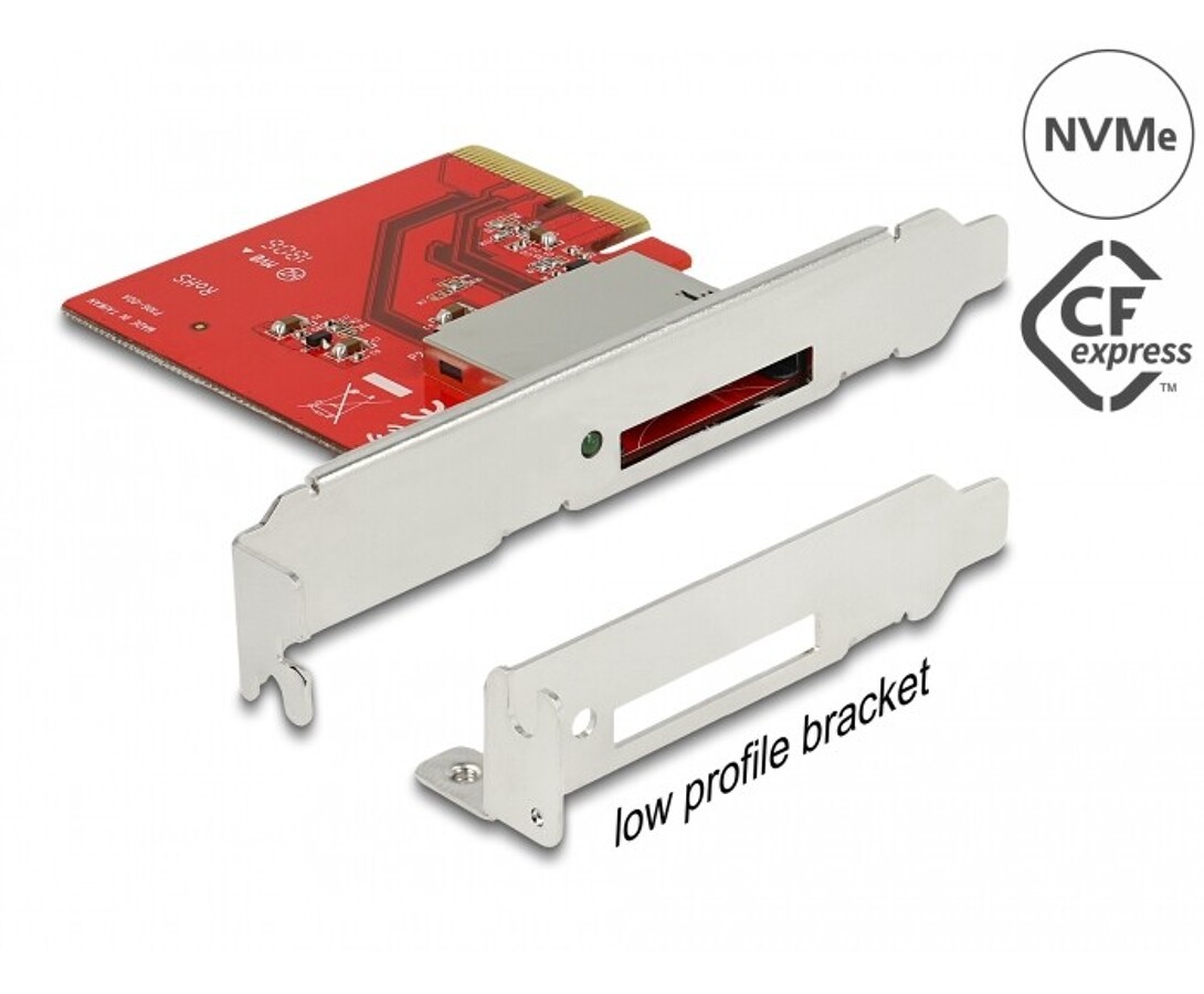 Karta PCI Express marki Delock rozszerza komputer osobisty o zewnętrzny slot CFexpress / XQD, umożliwiając odczyt i zapis na kartach pamięci CFexpress / XQD.