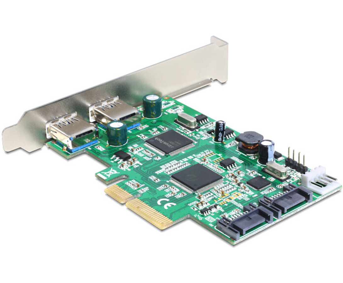 Karta PCI Express marki Delock dodaje do komputera rozszerzenie o dwa zewnętrzne porty USB 3.0 oraz dwa wewnętrzne porty SATA, umożliwiając podłączanie różnych urządzeń, takich jak dyski SSD, dyski twarde czy napędy DVD. Karta obsługuje szybkie przesyłanie danych oraz funkcje ładowania akumulatorów, w tym szybkie ładowanie urządzeń Apple.