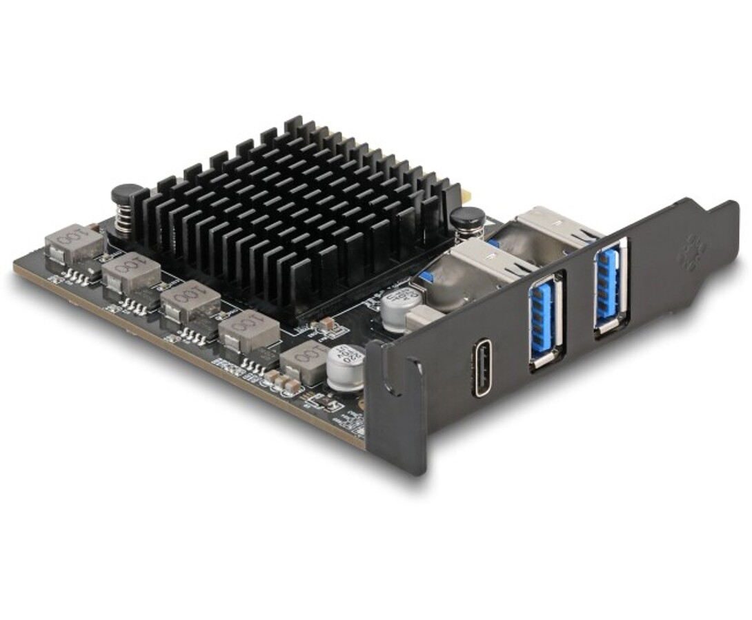 Karta PCI Express marki Delock rozszerza komputer o trzy porty USB: jeden port USB-C o przepustowości 20 Gbps oraz dwa porty USB typu A o przepustowości 10 Gbps. Umożliwia podłączenie różnych urządzeń USB. Karta oferuje transfer danych z prędkością 20 Gbps przez port USB-C oraz zasilanie dostarczane wyłącznie przez interfejs PCI Express.