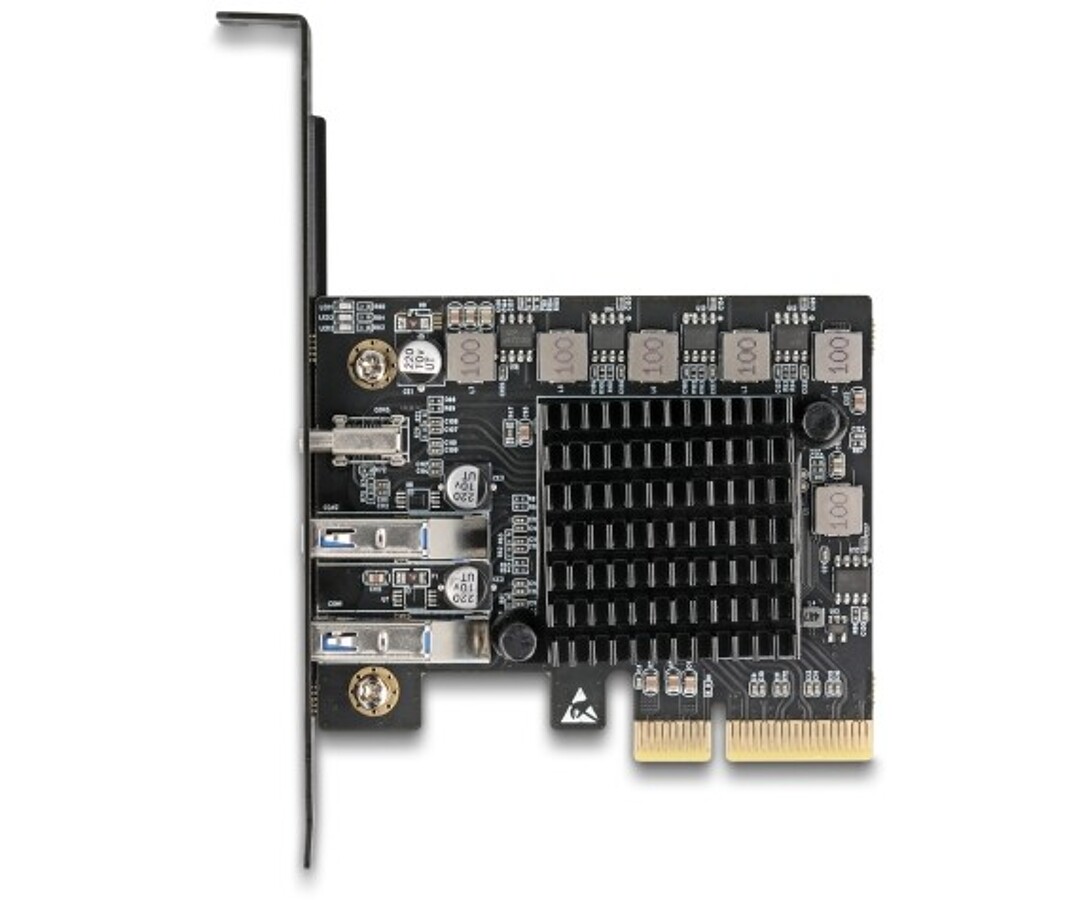 Karta PCI Express marki Delock dodaje do komputera cztery szybkie porty USB Type-C 20 Gbps, umożliwiając równoczesną obsługę wielu urządzeń przy pełnej przepustowości. Dzięki czterem chipsetom ASM3242 i układowi PLX PEX8747 zapewnia maksymalną wydajność oraz chłodzenie aktywne z wentylatorem 40 mm.