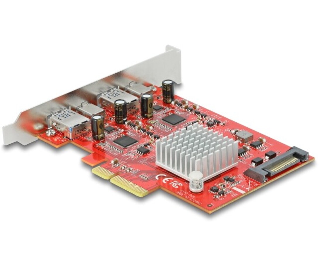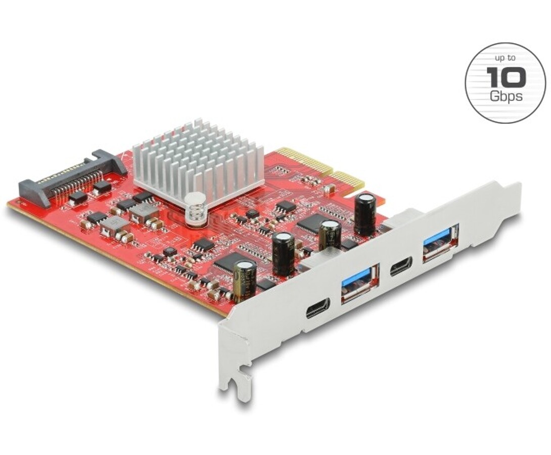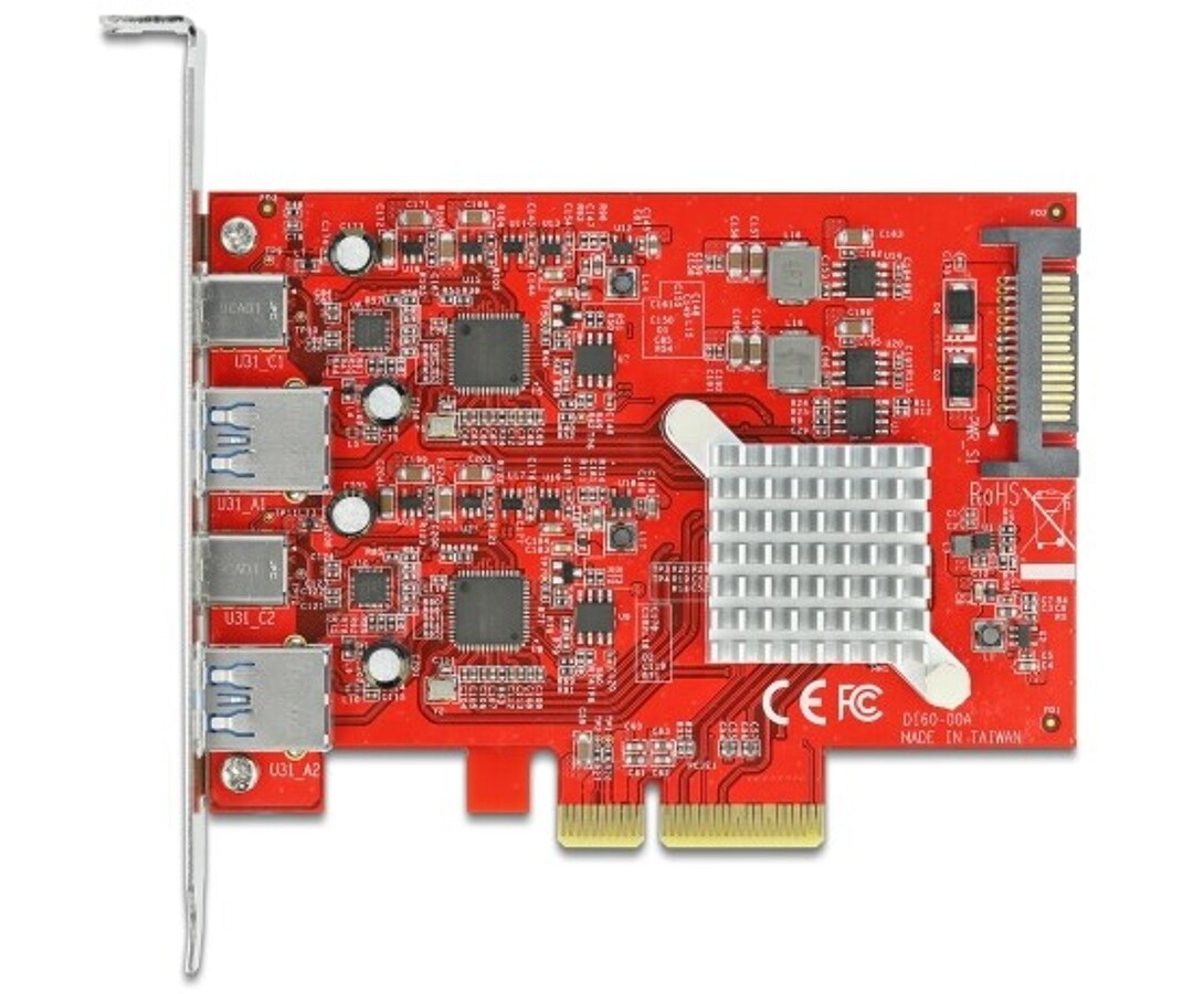 Karta PCI Express marki Delock rozszerza komputer o cztery zewnętrzne porty USB 3.2 Gen 2, w tym dwa porty USB typu C i dwa porty USB typu A, umożliwiając jednoczesne podłączenie różnych urządzeń, takich jak stacje dokujące, czytniki kart czy obudowy zewnętrzne. Konstrukcja typu dual channel z dwoma niezależnymi chipsetami Asmedia ASM3142 dla każdego portu zapewnia pełną prędkość transmisji 10Gb/s na wszystkich portach równocześnie. Zasilanie realizowane jest przez złącze PCI Express, a w razie potrzeby możliwe jest podłączenie dodatkowego zasilania przez 15-pinowe złącze SATA. Każdy port USB typu C oferuje moc do 15 W, a porty typu A do 10 W. Urządzenie jest kompatybilne z interfejsem xHCI 1.1, obsługuje funkcję rozruchową oraz pełną zgodność wsteczną z wcześniejszymi standardami USB.