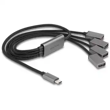 Hub USB marki Delock w solidnej metalowej obudowie umożliwia rozszerzenie komputera lub laptopa o cztery porty USB 5 Gbps Typu-A poprzez interfejs USB Type-C. Dzięki kompaktowej konstrukcji i trwałemu wykonaniu doskonale sprawdza się w biurze i w podróży. Obsługuje Plug & Play, co pozwala na natychmiastowe działanie bez instalacji sterowników.