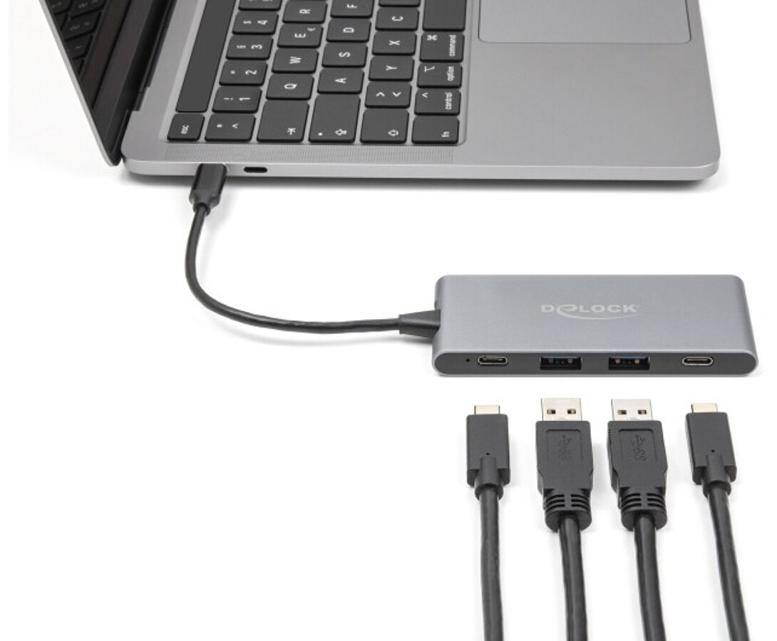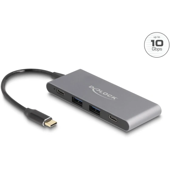 Hub USB marki Delock umożliwia rozbudowę urządzenia o cztery porty USB-C z szybkim transferem danych do 10 Gbps. Dodatkowy port zasilania zapewnia stabilne działanie nawet przy większym obciążeniu. Kompaktowa konstrukcja i aluminiowa obudowa czynią go idealnym rozwiązaniem do zastosowań mobilnych i biurowych.