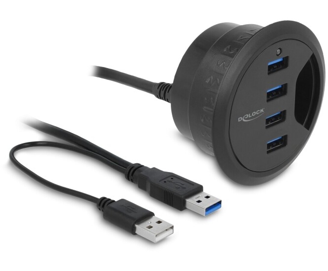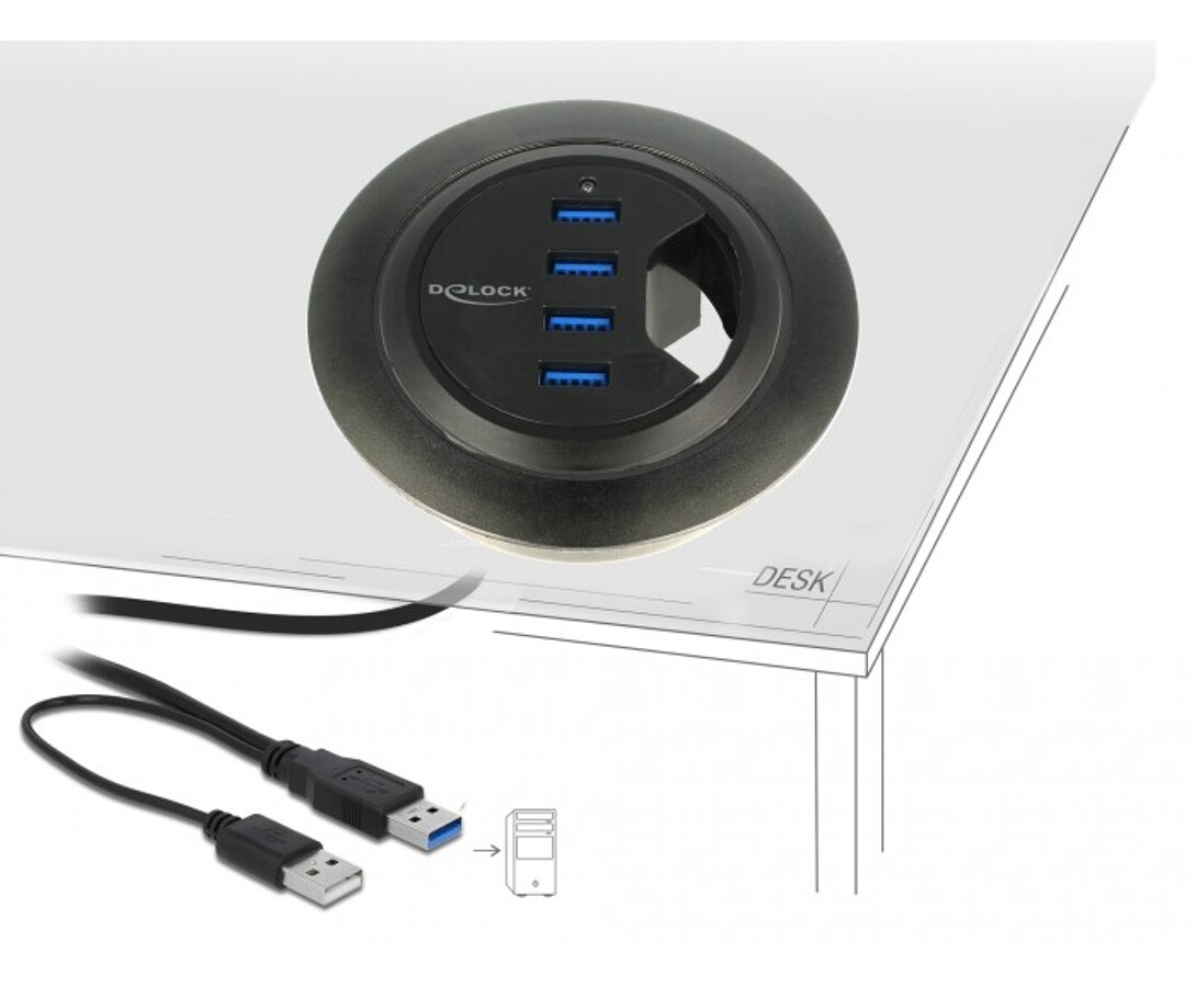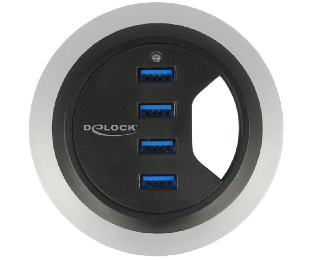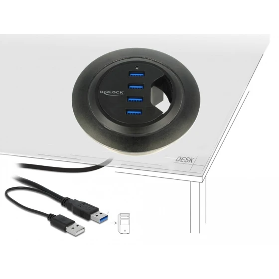 Hub marki Delock przeznaczony do montażu w biurku umożliwia jednoczesne przeprowadzenie przewodów oraz rozszerzenie komputera o cztery porty USB 5 Gbps Typu-A. Konstrukcja umożliwia instalację w otworach o średnicy 60 mm lub 80 mm, co pozwala dopasować urządzenie do większości biurek. Hub zapewnia szybki transfer danych i stabilne zasilanie dzięki dwóm przewodom – jednym USB 5 Gbps Typu-A dla transmisji danych oraz drugim USB 2.0 Typu-A dla zasilania. Oba przewody są połączone i oferują elastyczny zasięg do 20 cm między wtykami. Instalacja jest prosta i nie wymaga sterowników, dzięki obsłudze Plug & Play.