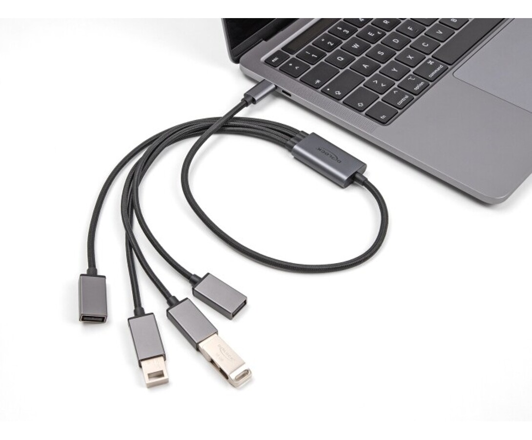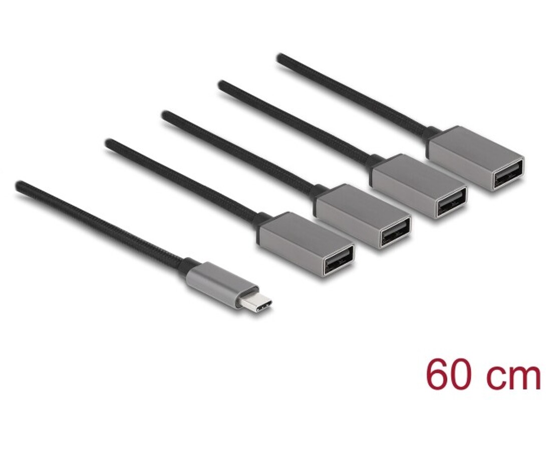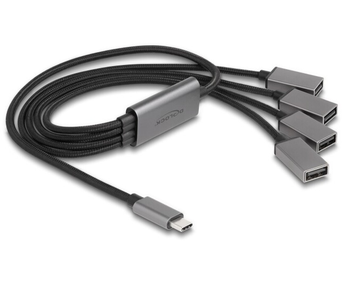 Koncentrator USB marki Delock z interfejsem USB-C umożliwia rozbudowę komputera, laptopa lub urządzenia mobilnego o cztery porty USB Typu-A, pozwalając na podłączenie akcesoriów takich jak pamięci flash, czytniki kart czy obudowy zewnętrzne. Elastyczny przewód w mocnej tkanej osłonie zapewnia trwałość i odporność na uszkodzenia mechaniczne, a metalowe końcówki gwarantują solidne połączenie. Urządzenie działa w trybie Plug & Play, co umożliwia natychmiastowe użytkowanie bez konieczności instalacji sterowników.