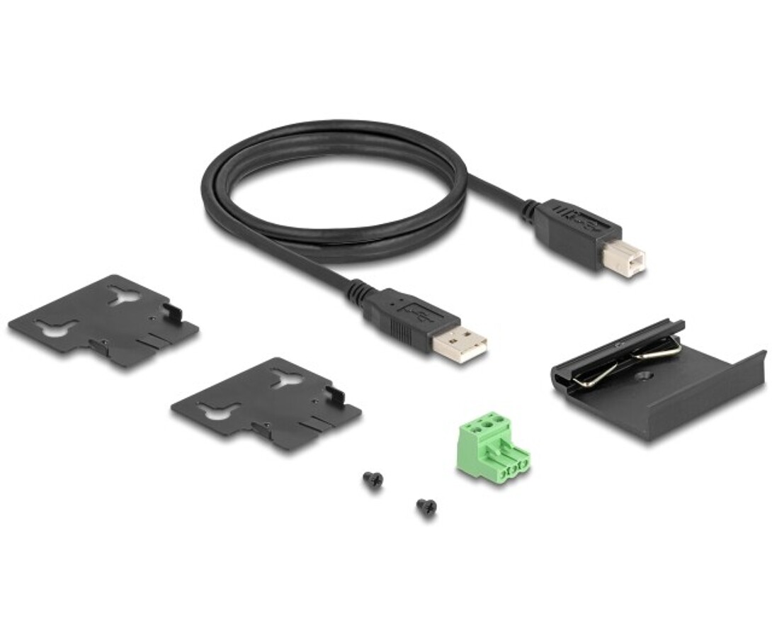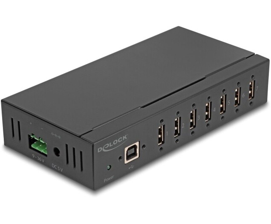 Koncentrator USB marki Delock przeznaczony do zastosowań przemysłowych umożliwia rozbudowę komputera o siedem portów USB Typu-A poprzez połączenie z interfejsem USB Typu-B. Solidna metalowa konstrukcja gwarantuje odporność na warunki przemysłowe oraz stabilność działania w trudnym środowisku pracy. Każdy port USB posiada otwory montażowe z gwintem M3, co pozwala na przykręcenie przewodów i zabezpieczenie połączeń przed przypadkowym odłączeniem. Urządzenie wyposażono w płytki montażowe oraz wspornik do instalacji na szynie DIN, dzięki czemu może być łatwo zamontowane w szafie sterowniczej. Porty USB są chronione przed wyładowaniami elektrostatycznymi do 15 kV, a zasilanie może być dostarczane zarówno przez magistralę USB, jak i zewnętrzne źródło napięcia 5V DC lub 9–36V poprzez terminal. Wskaźnik LED informuje o stanie pracy koncentratora.