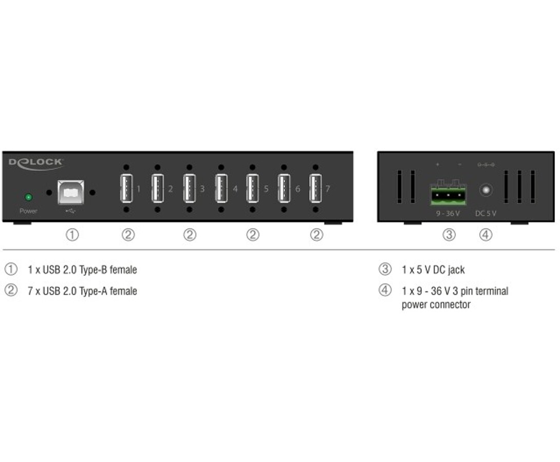 - Złącza: 1 x USB 2.0 typu B żeńskie, 7 x USB 2.0 typu A żeńskie, 1 x gniazdo zasilania 5V DC, 1 x 3-pinowe złącze zasilania 9–36 V