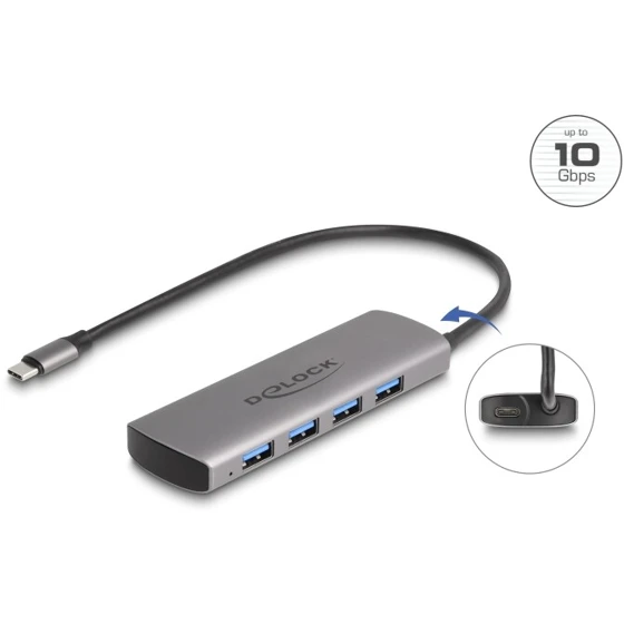 Hub USB marki Delock z interfejsem USB-C umożliwia podłączenie czterech urządzeń USB-C i ładowanie sprzętu z mocą do 85 W dzięki obsłudze Power Delivery. Zapewnia transfer danych do 10 Gbps, idealny do pracy z nowoczesnymi akcesoriami. Aluminiowa obudowa gwarantuje trwałość i mobilność, a funkcja Plug & Play umożliwia natychmiastowe działanie.
