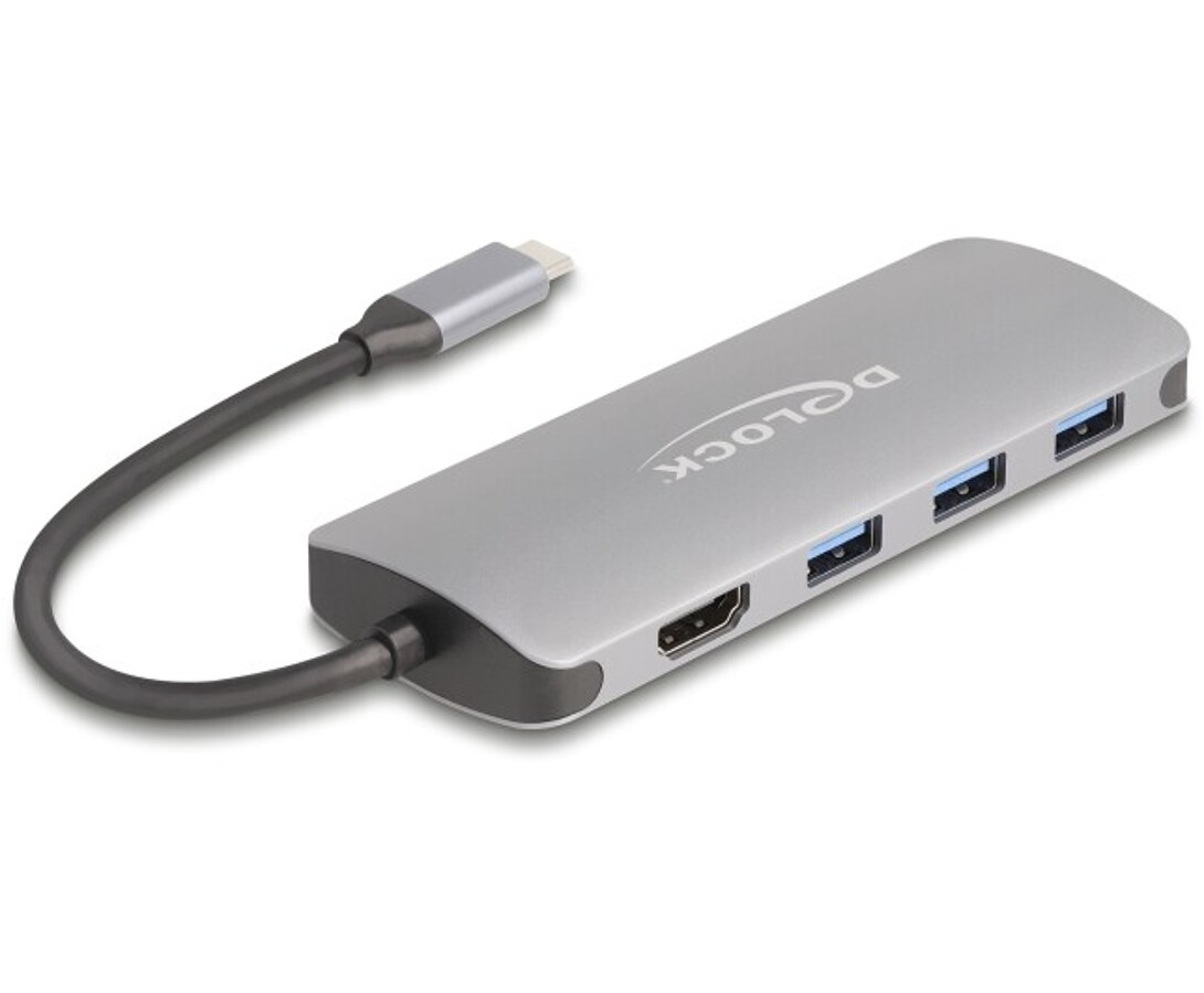 Hub USB marki Delock z portem HDMI umożliwia podłączenie trzech urządzeń USB-A oraz monitora 4K przez złącze USB-C, zapewniając jednoczesną transmisję danych, obrazu i zasilanie Power Delivery do 85 W. Aluminiowa obudowa i kompaktowa konstrukcja czynią go praktycznym rozwiązaniem dla laptopów, tabletów i smartfonów.