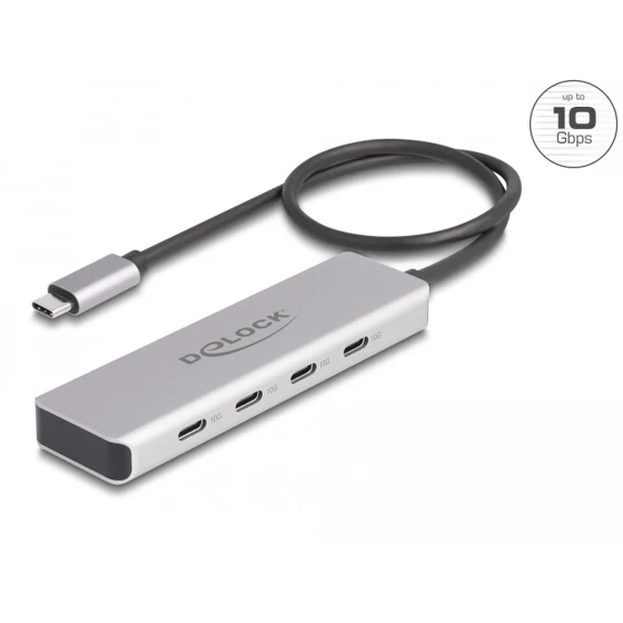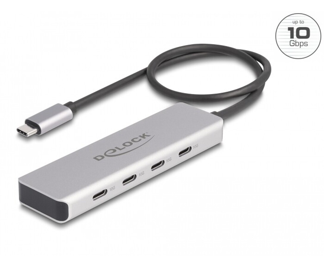 Hub USB marki Delock umożliwia rozbudowę urządzenia o cztery porty USB-C z szybkim transferem danych do 10 Gbps. Dodatkowy port zasilania zapewnia stabilne działanie nawet przy większym obciążeniu. Kompaktowa konstrukcja i aluminiowa obudowa czynią go idealnym rozwiązaniem do zastosowań mobilnych i biurowych.