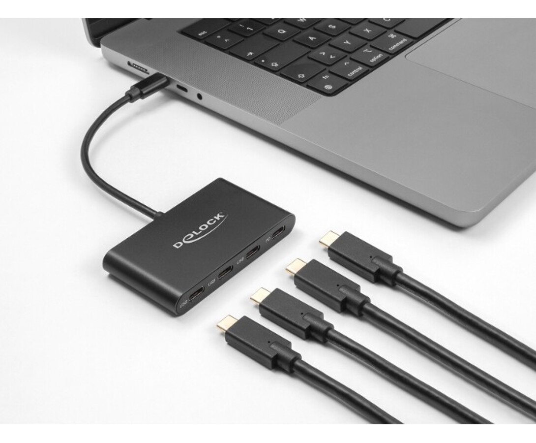 Hub USB marki Delock w metalowej obudowie umożliwia jednoczesne podłączenie i zasilanie czterech urządzeń USB-C z prędkością do 5 Gbps. Dodatkowy port zasilania zapewnia stabilne działanie nawet przy większym obciążeniu. Solidna i kompaktowa konstrukcja sprawia, że idealnie nadaje się do użytku biurowego i mobilnego.