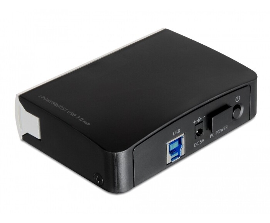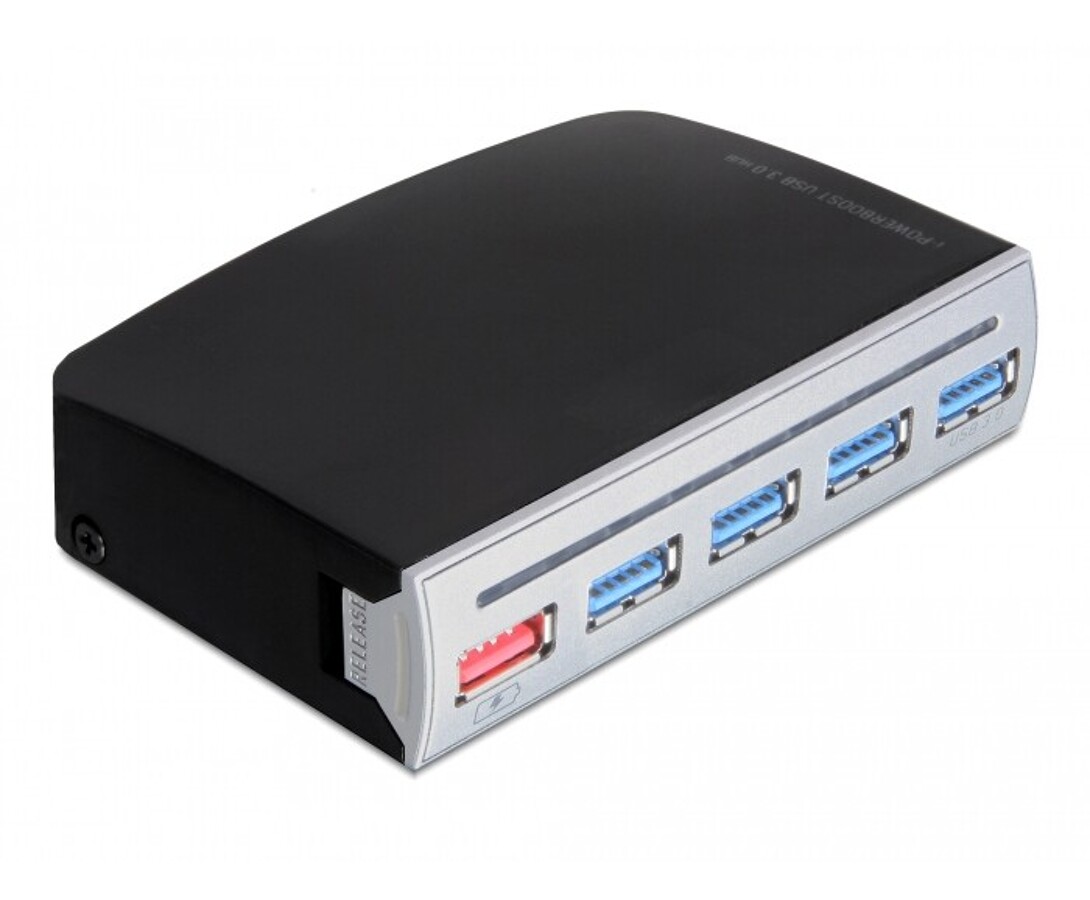 Hub USB marki Delock w metalowej obudowie umożliwia jednoczesne podłączenie i zasilanie czterech urządzeń USB-C z prędkością do 5 Gbps. Dodatkowy port zasilania zapewnia stabilne działanie nawet przy większym obciążeniu. Solidna i kompaktowa konstrukcja sprawia, że idealnie nadaje się do użytku biurowego i mobilnego.