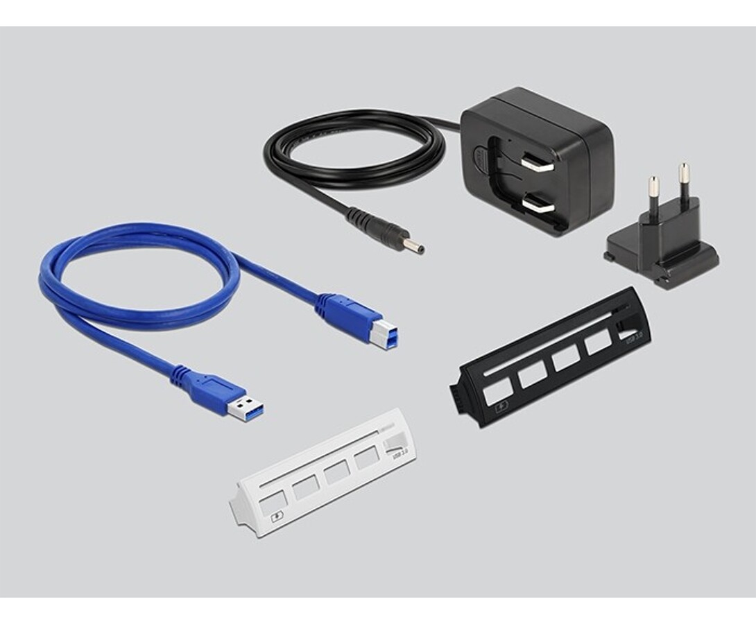 Hub USB 5 Gbps marki Delock umożliwia rozbudowę komputera PC lub notebooka o cztery dodatkowe porty USB 5 Gbps oraz jeden port USB służący do ładowania urządzeń z maksymalnym natężeniem 2 A. Może być używany jako urządzenie zewnętrzne z dołączonym zasilaczem lub zamontowany we wnęce 3.5" obudowy komputera. Wystarczy podłączyć zasilanie z zasilacza komputera oraz wyprowadzić kabel USB 5 Gbps na zewnątrz. W zestawie znajdują się trzy wymienne panele w kolorach czarnym, srebrnym i beżowym, umożliwiające dopasowanie wyglądu urządzenia do obudowy komputera. Hub obsługuje szybki transfer danych do 5 Gbps i zapewnia stabilne zasilanie podłączonych urządzeń.