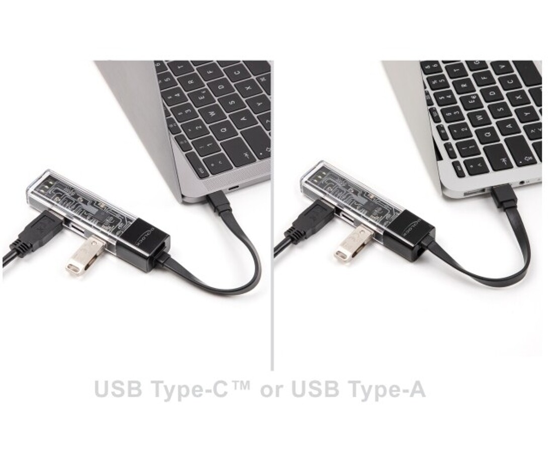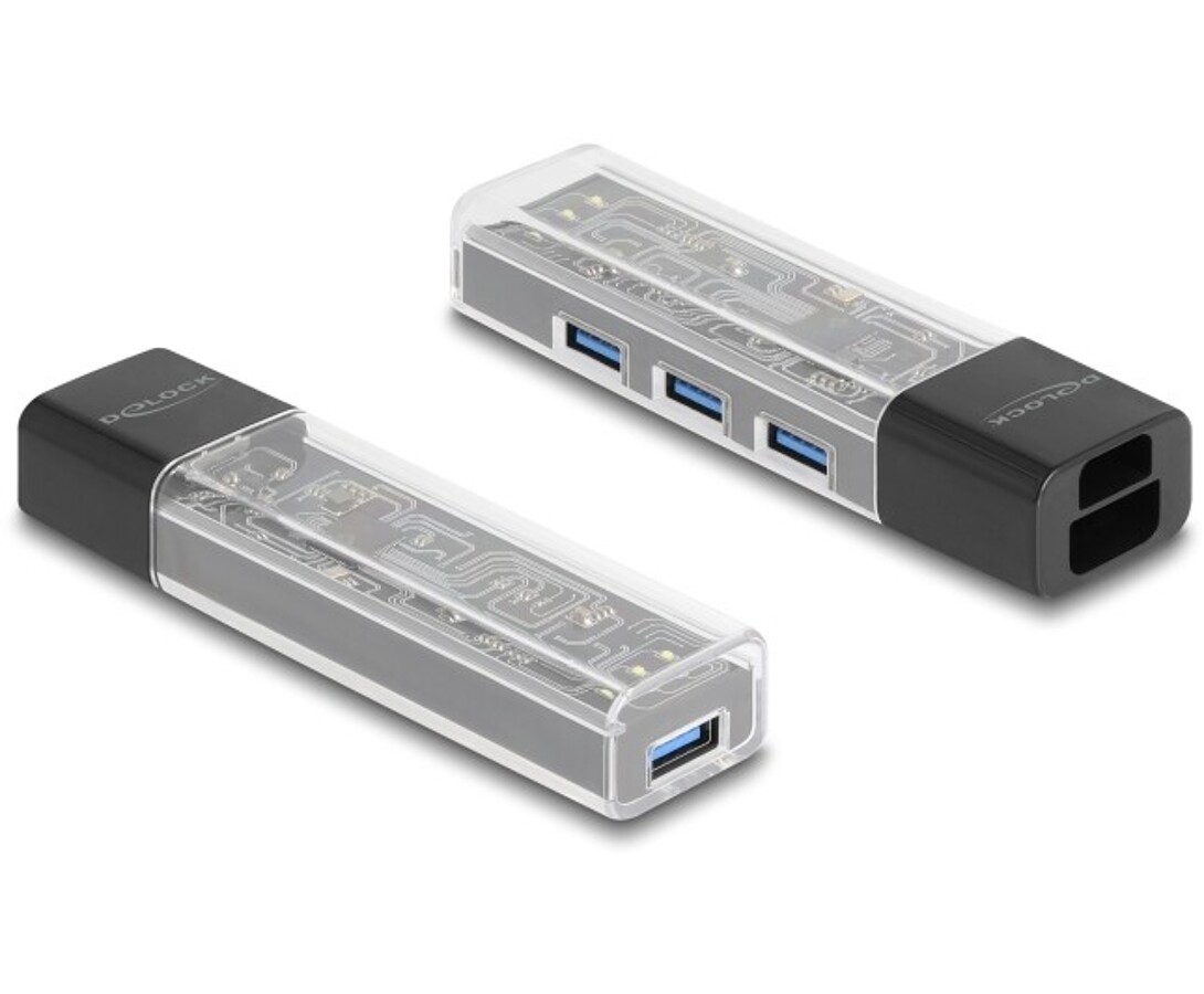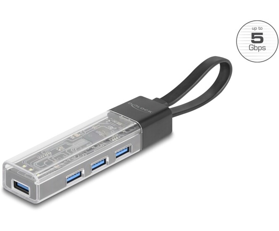 Hub USB marki Delock z przezroczystą obudową umożliwia rozszerzenie komputera, laptopa lub urządzenia mobilnego o cztery dodatkowe porty USB-A. Dzięki dołączonemu kablowi z końcówkami USB-A i USB-C można go łatwo podłączyć zarówno do starszych, jak i nowszych urządzeń. Konstrukcja pozwala na odłączenie lub spięcie kabla w pętlę, co ułatwia przechowywanie i transport. Trzy podświetlane diody LED nadają urządzeniu nowoczesny wygląd i sygnalizują jego działanie. Kompaktowy rozmiar oraz odporna, przezroczysta obudowa sprawiają, że hub idealnie sprawdza się w biurze, w domu i w podróży.