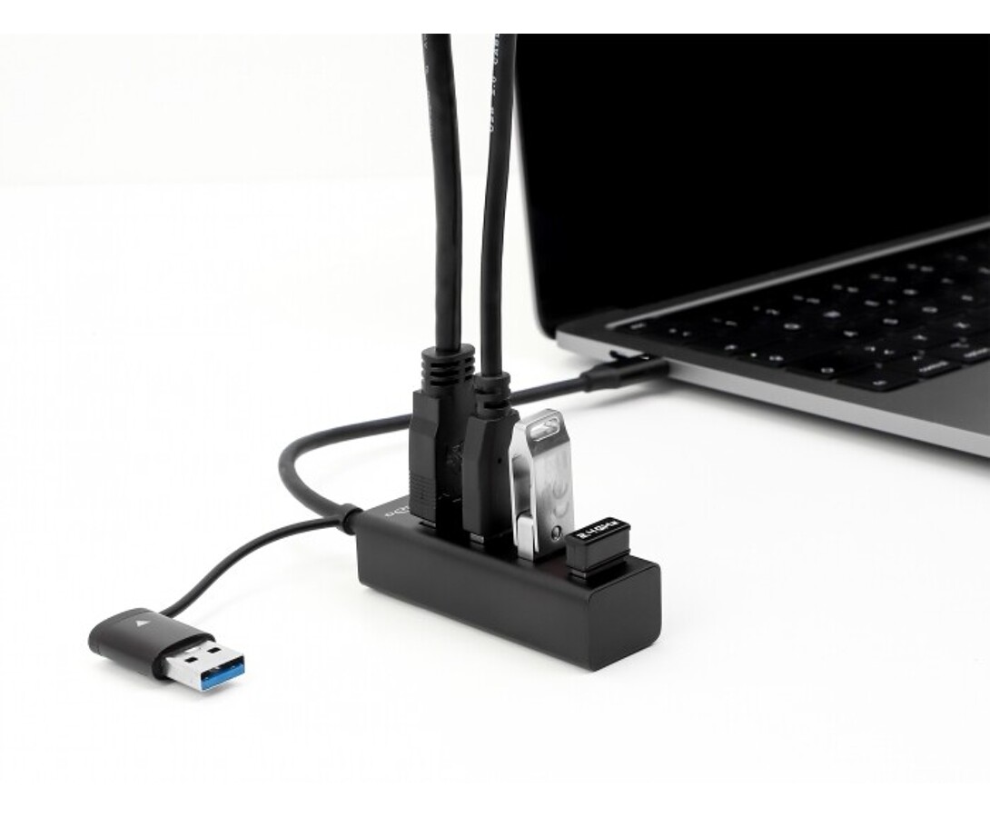 Hub USB marki Delock w metalowej obudowie umożliwia podłączenie do komputera, laptopa lub urządzenia mobilnego przez interfejs USB typu C lub USB typu A, oferując cztery dodatkowe porty USB 5 Gbps typu A do podłączenia urządzeń takich jak pamięci flash, czytniki kart, klawiatury czy obudowy zewnętrzne. Zintegrowany adapter USB typu C/USB typu A zwiększa kompatybilność z nowoczesnymi i starszymi urządzeniami, a kompaktowa konstrukcja z aluminiową obudową sprawia, że hub jest trwały i wygodny w podróży. Wbudowana dioda LED informuje o aktywnym połączeniu.