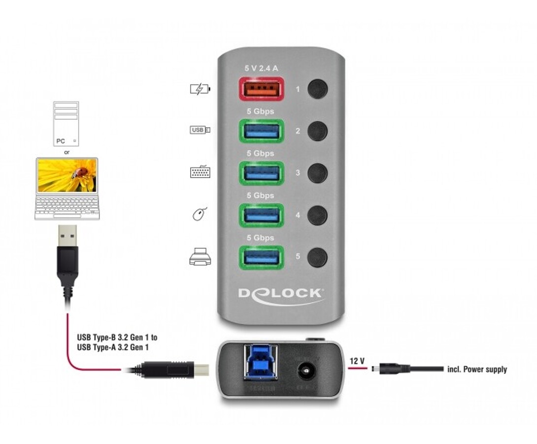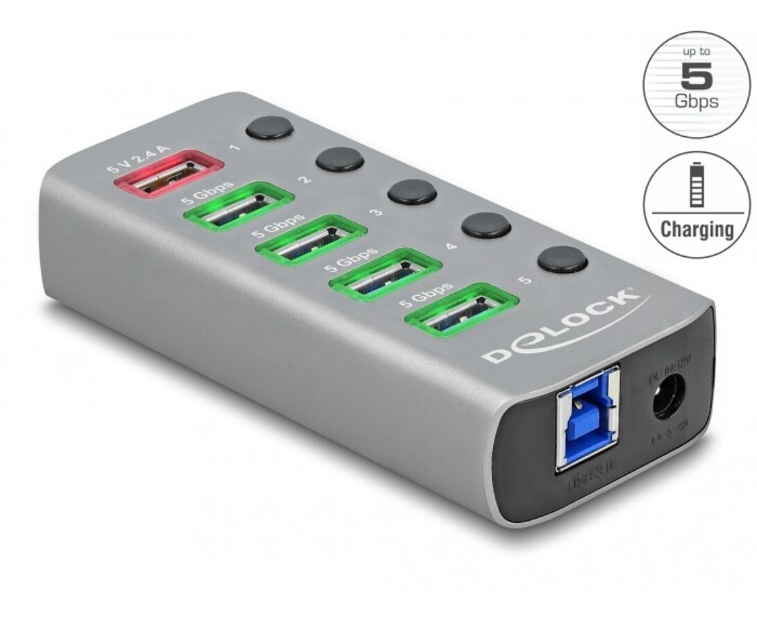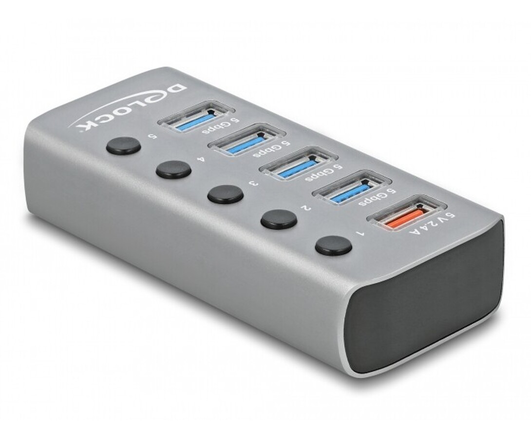Hub USB marki Delock w metalowej obudowie umożliwia rozbudowę komputera o cztery porty USB 5 Gbps Typu-A oraz dodatkowy port szybkiego ładowania o natężeniu do 2,4 A. Umożliwia jednoczesne przesyłanie danych i ładowanie urządzeń mobilnych, takich jak smartfony czy tablety. Każdy port USB wyposażony jest w podświetlenie LED oraz indywidualny przełącznik, który pozwala na włączanie lub wyłączanie wybranych złączy. Solidna obudowa z metalu gwarantuje trwałość, a obsługa Plug & Play zapewnia natychmiastowe działanie bez konieczności instalacji sterowników.
