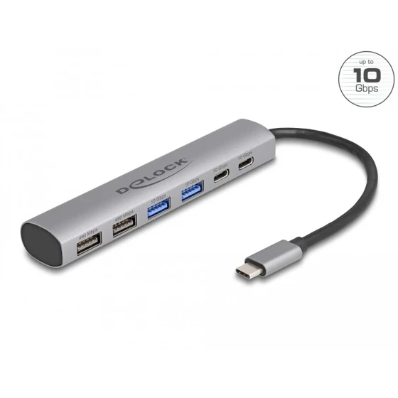 Hub USB marki Delock z interfejsem USB-C umożliwia jednoczesne podłączenie urządzeń z portami USB Typu-A i Typu-C, zapewniając szybki transfer danych do 10 Gbps. Aluminiowa obudowa i długi przewód gwarantują trwałość i wygodę użytkowania, a funkcja Plug & Play pozwala na natychmiastową pracę bez instalacji sterowników.