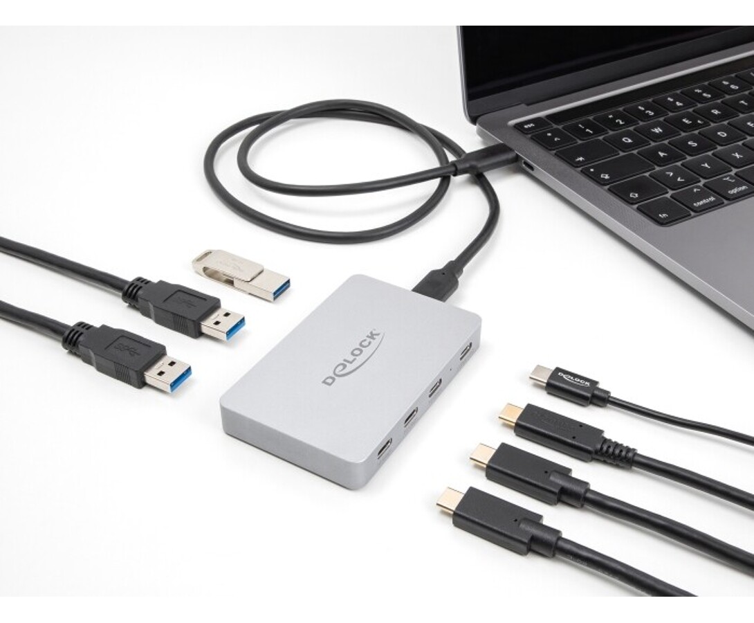 Hub USB marki Delock z interfejsem USB-C umożliwia podłączenie czterech urządzeń USB-C i ładowanie sprzętu z mocą do 85 W dzięki obsłudze Power Delivery. Zapewnia transfer danych do 10 Gbps, idealny do pracy z nowoczesnymi akcesoriami. Aluminiowa obudowa gwarantuje trwałość i mobilność, a funkcja Plug & Play umożliwia natychmiastowe działanie.