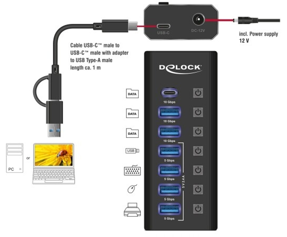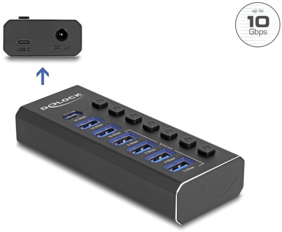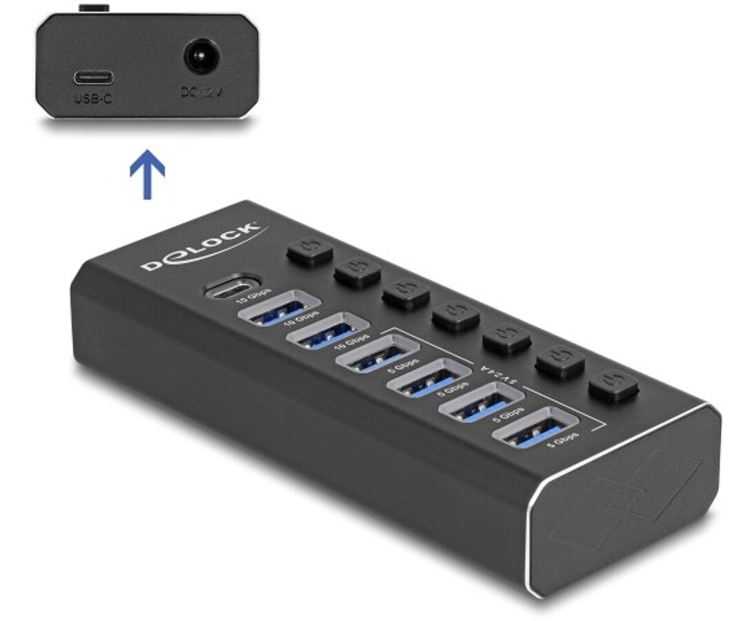 Hub USB marki Delock w metalowej obudowie rozszerza komputer lub laptop o siedem dodatkowych portów USB, zapewniając szybki transfer danych do 5 Gbps. Dzięki dwóm interfejsom – USB-A i USB-C – jest kompatybilny zarówno z nowoczesnymi, jak i starszymi urządzeniami. Solidna konstrukcja i zintegrowany adapter gwarantują trwałość i wygodę użytkowania.