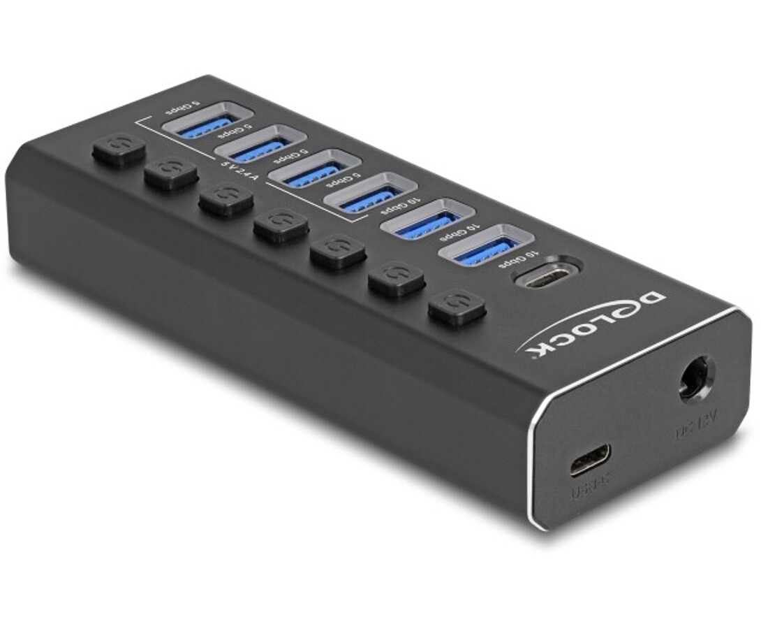 Hub USB marki Delock z metalową obudową umożliwia podłączenie do komputera przez interfejs USB-A lub USB-C, zapewniając jednocześnie szerokie możliwości rozbudowy. Oferuje cztery porty USB-A 5 Gbps z funkcją szybkiego ładowania (5V / 2,4 A), dwa porty USB-A 10 Gbps oraz jeden port USB-C 10 Gbps. Dzięki temu pozwala na jednoczesne ładowanie wielu urządzeń, transfer danych oraz obsługę nowoczesnych akcesoriów. Każdy port USB-A posiada podświetlenie LED oraz indywidualny przełącznik zasilania, co umożliwia pełną kontrolę nad podłączonymi urządzeniami. Solidna, metalowa konstrukcja zapewnia trwałość i stabilność podczas codziennego użytkowania.