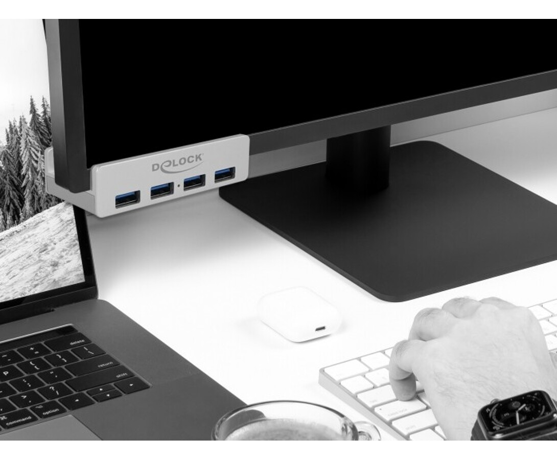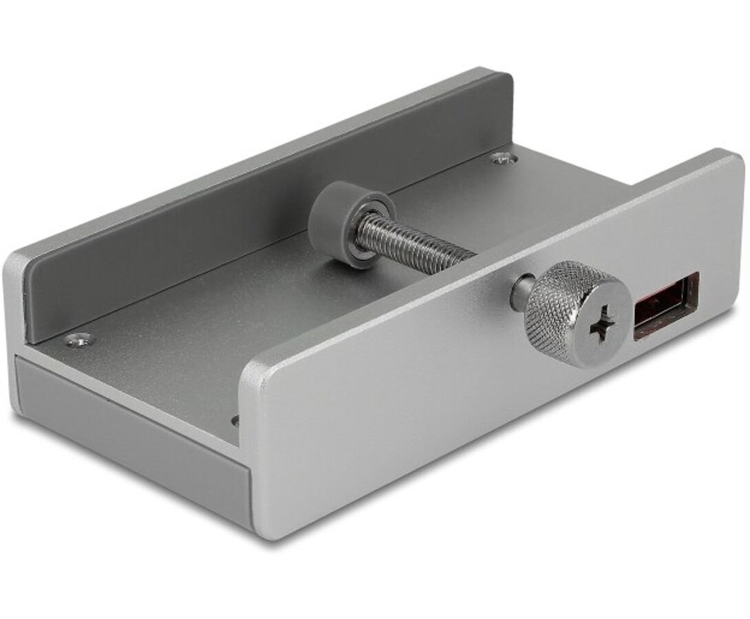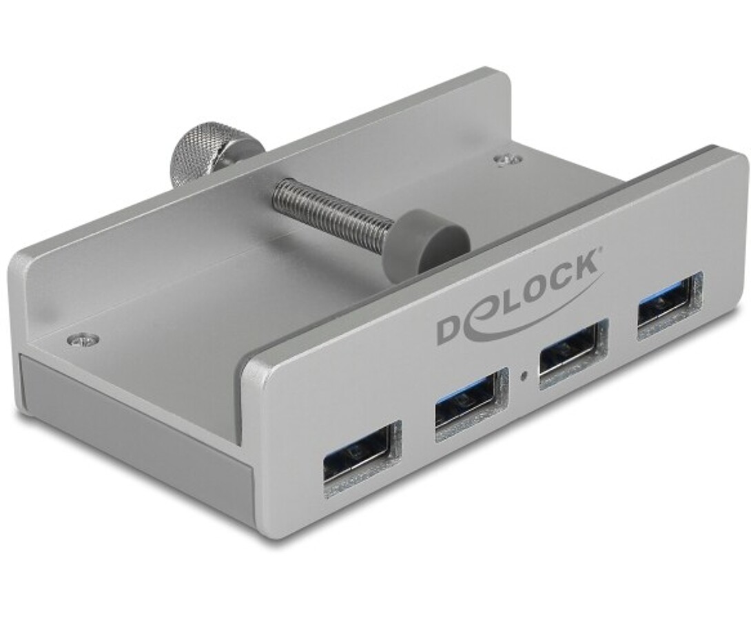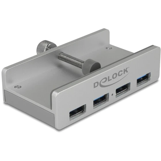 Hub USB marki Delock w obudowie metalowej umożliwia rozbudowę komputera o cztery dodatkowe porty USB 5 Gbps Typu-A. Dzięki specjalnej konstrukcji z możliwością montażu i śrubie mocującej, urządzenie można stabilnie przymocować do krawędzi biurka lub monitora, co zapewnia wygodny i stały dostęp do portów USB. Stabilne mocowanie pozwala także na łatwe podłączanie urządzeń jedną ręką. Metalowa obudowa gwarantuje trwałość, a kompaktowy rozmiar sprawia, że hub sprawdza się zarówno w biurze, jak i w zastosowaniach przemysłowych.