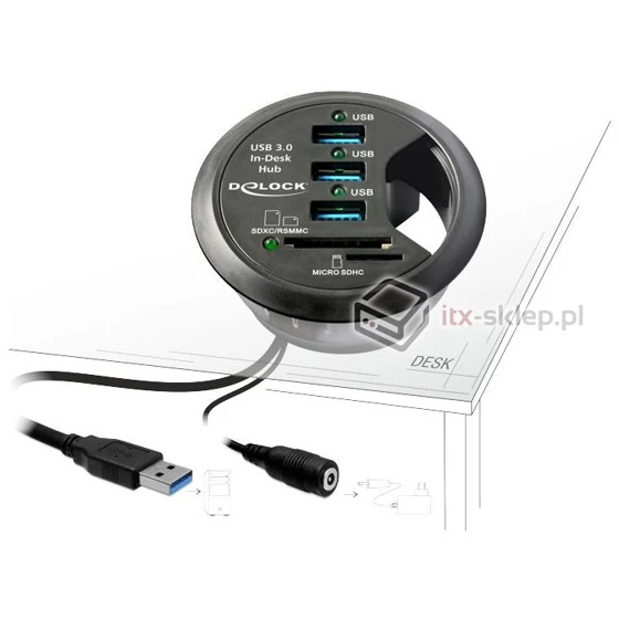 Elegancki 3-portowy hub USB 3.0 firmy Delock przeznaczony do montażu w wycięciu biurka pozwalający przeprowadzić wiązkę przewodów od monitora, klawiatury oraz myszy. Możliwości urządzenia zwiększa zintegrowany 2-slotowy czytnik kart (1x gniazdo SD i 1x gniazdo micro SD). Prezentowane rozwiązanie jest niezwykle praktyczne, pozwala zaoszczędzić w znacznym stopniu miejsce na biurku. Średnica montażu wynosi 60mm, natomiast głębokość montażu to 30mm.