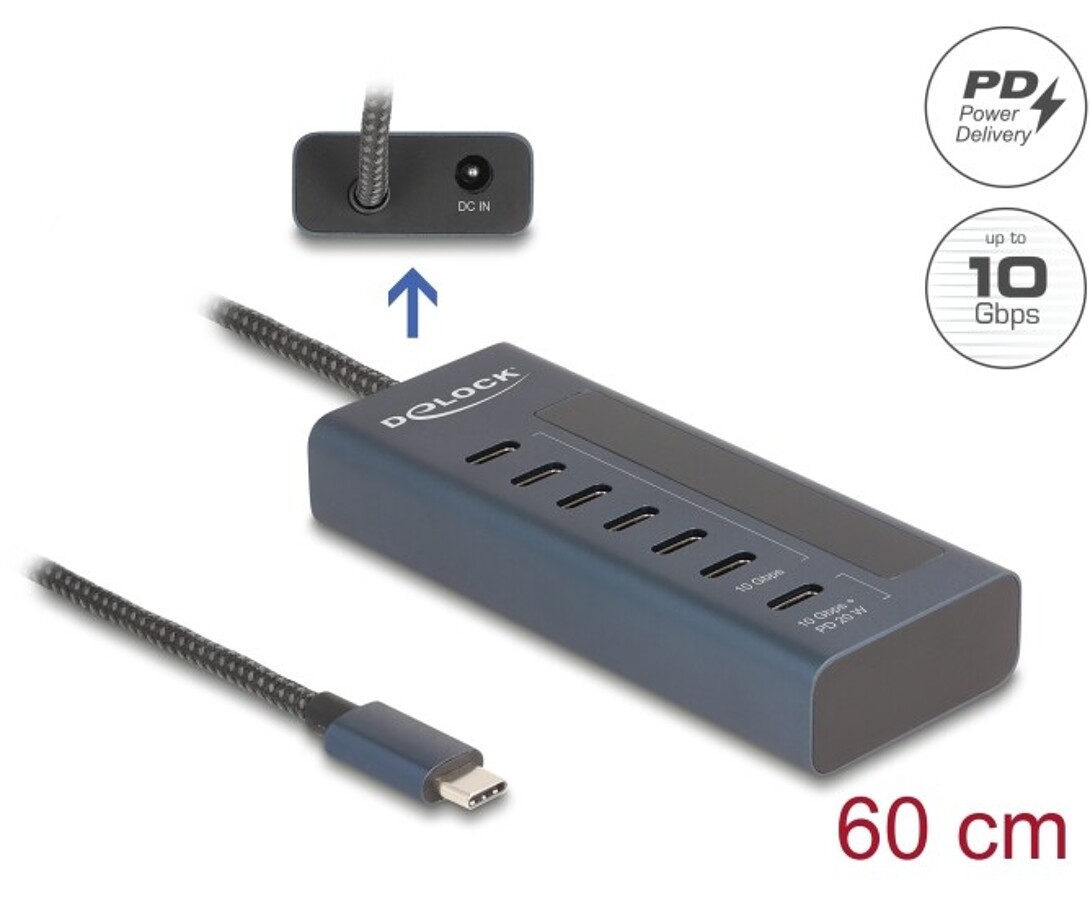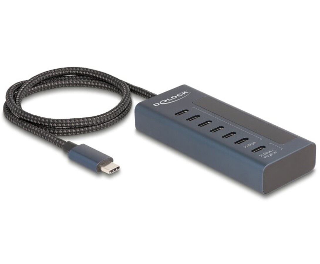 Hub USB marki Delock umożliwia podłączenie do siedmiu urządzeń przez port USB-C i oferuje obsługę Power Delivery 3.0 o mocy do 80 W. Trzy porty USB-A oraz cztery USB-C zapewniają szybki transfer danych i możliwość ładowania laptopa, a solidna aluminiowa obudowa gwarantuje trwałość w codziennym użytkowaniu.