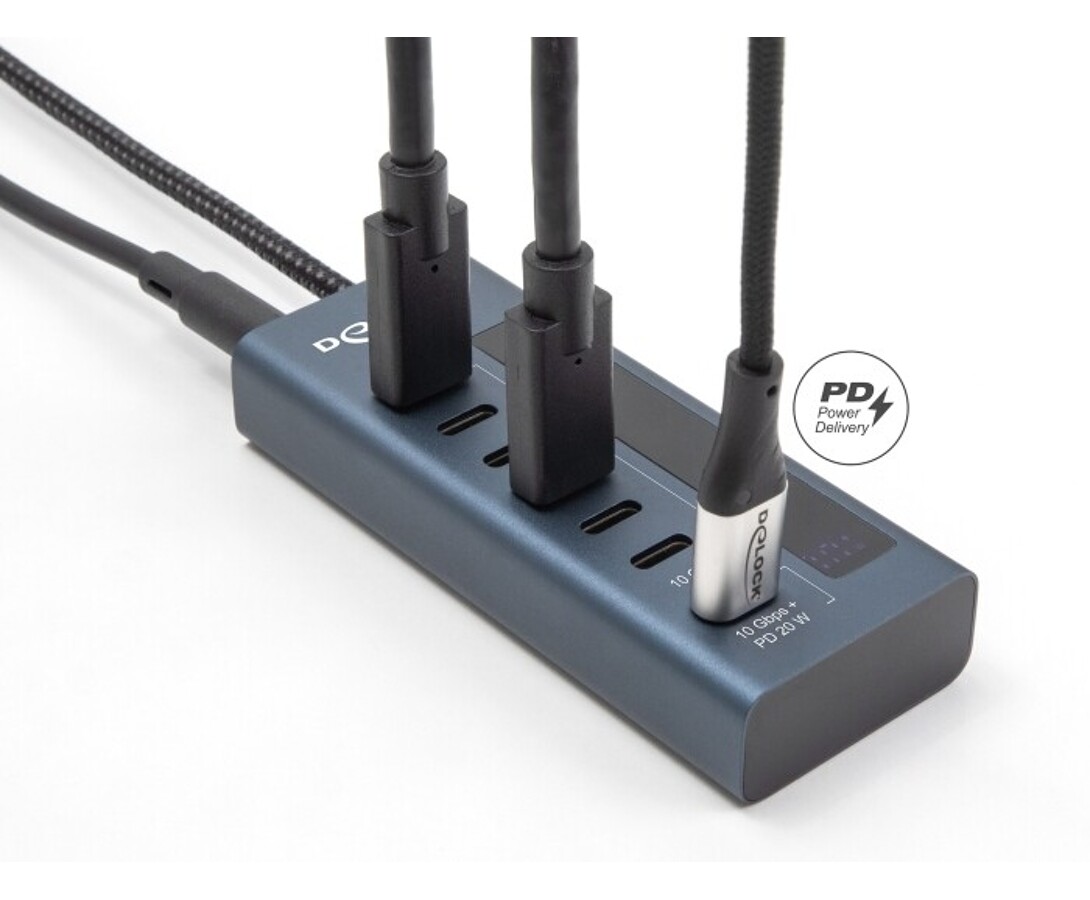 Hub USB marki Delock w metalowej obudowie umożliwia jednoczesne podłączenie i zasilanie czterech urządzeń USB-C z prędkością do 5 Gbps. Dodatkowy port zasilania zapewnia stabilne działanie nawet przy większym obciążeniu. Solidna i kompaktowa konstrukcja sprawia, że idealnie nadaje się do użytku biurowego i mobilnego.