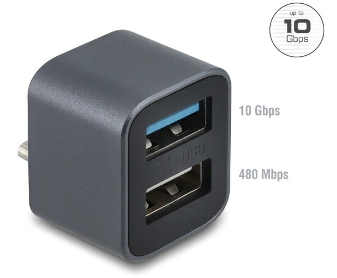 Solidny hub USB firmy Delock z metalową obudową może być podłączony do komputera, laptopa lub urządzenia mobilnego za pomocą interfejsu USB Type-C™. Rozszerza on komputer o 2 porty USB Type-A. Umożliwia podłączenie różnych urządzeń USB, takich jak pamięci flash USB, czytniki kart, obudowy zewnętrzne i inne.