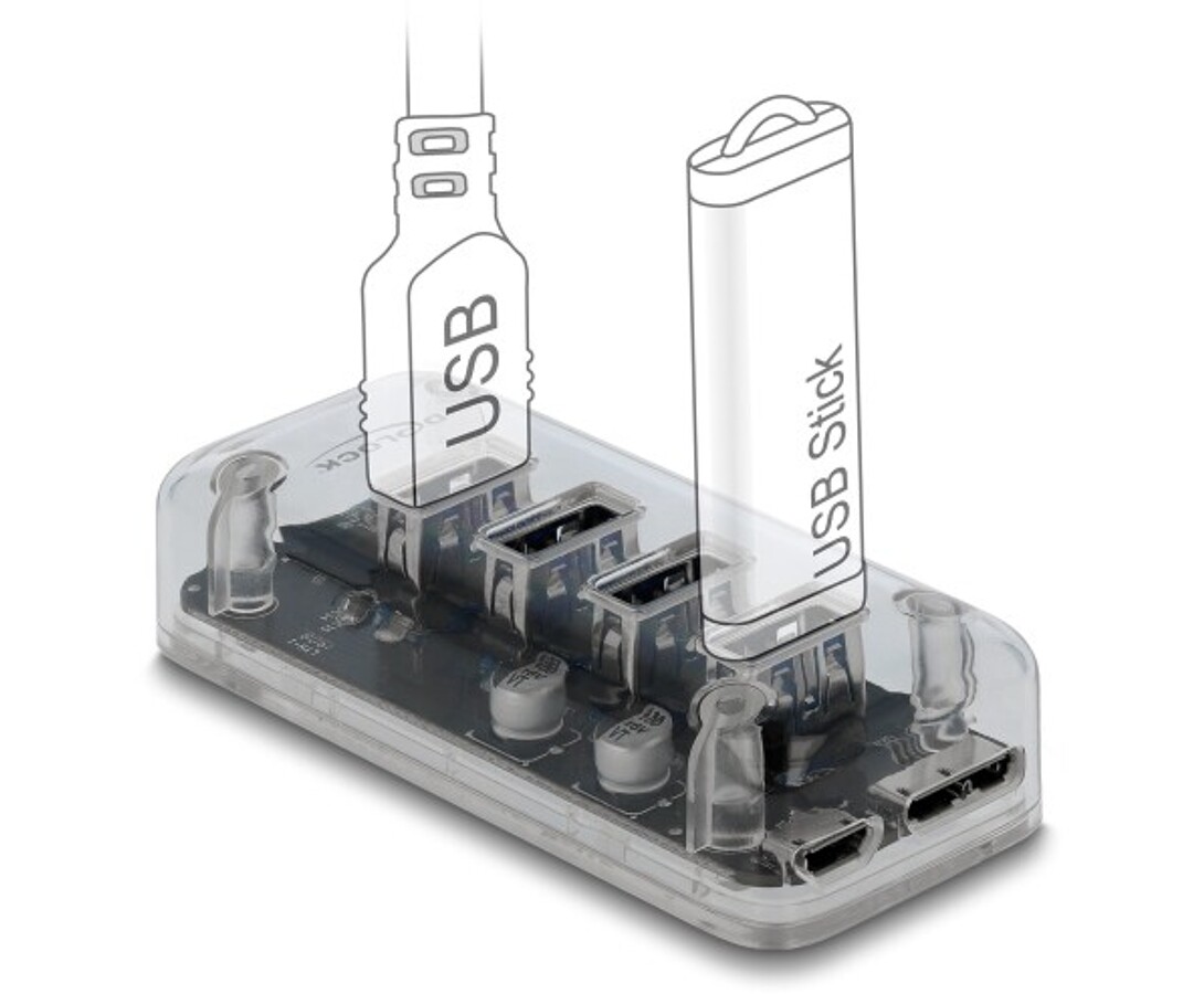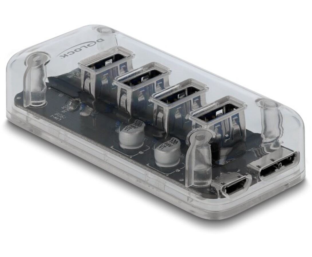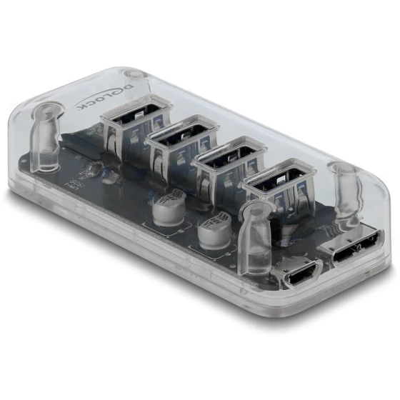Hub USB marki Delock umożliwia rozbudowę komputera o cztery dodatkowe porty USB Typu-A, oferując transfer danych do 5 Gbps oraz możliwość ładowania urządzeń mobilnych. Przezroczysta obudowa z niebieskim podświetleniem LED nadaje mu elegancki, nowoczesny wygląd, a jednocześnie pozwala zobaczyć jego wewnętrzne komponenty. Dodatkowe gniazdo zasilania Micro-B zapewnia stabilne zasilanie nawet przy jednoczesnym korzystaniu z kilku urządzeń USB. Kompaktowa konstrukcja i funkcja Plug & Play sprawiają, że hub sprawdza się w codziennym użytkowaniu biurowym i domowym.