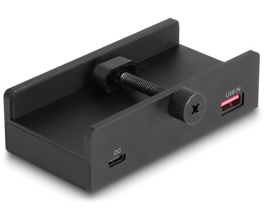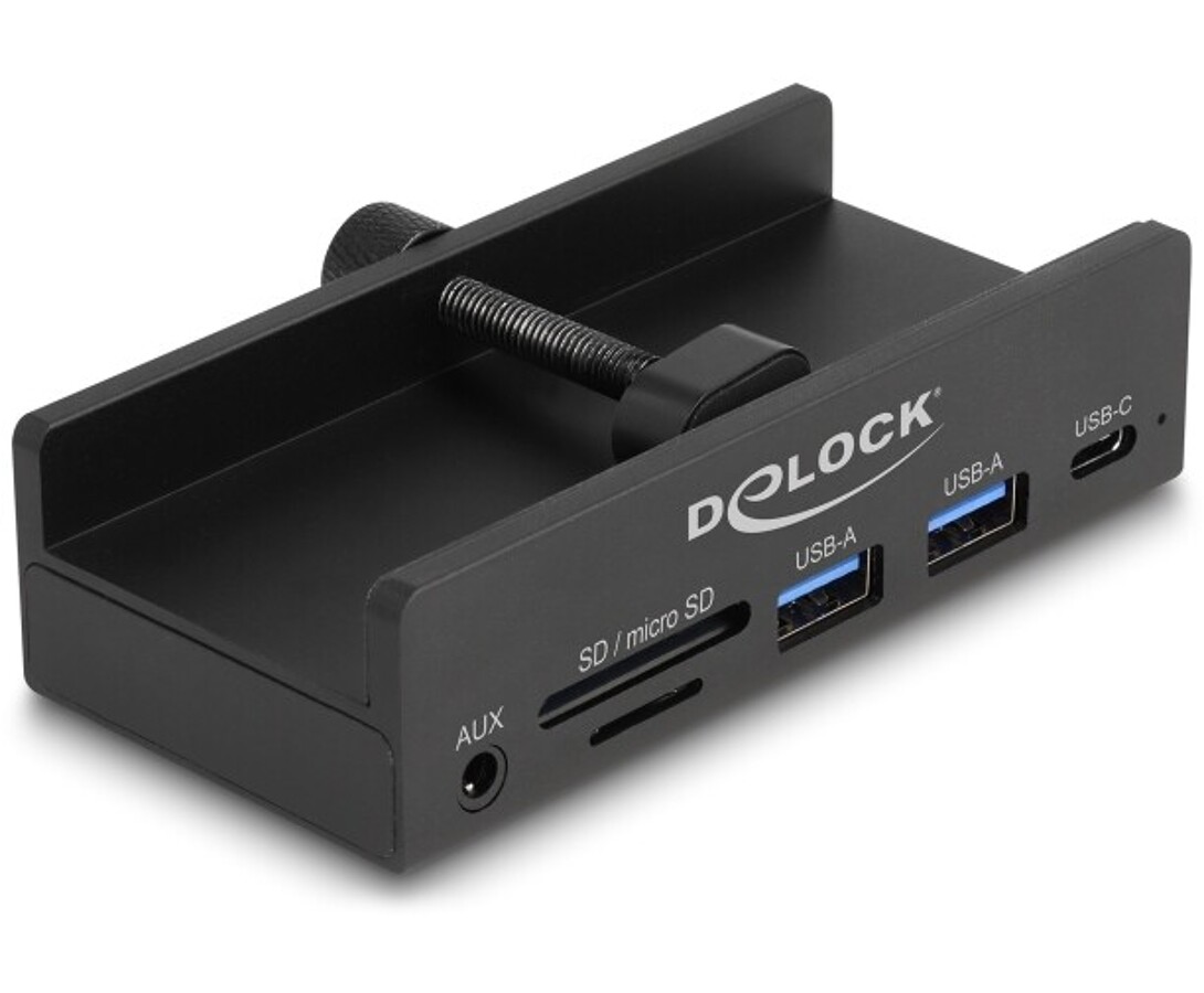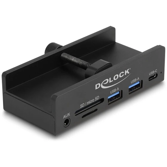 Hub USB marki Delock w metalowej obudowie oferuje cztery porty USB 5 Gbps Typu-A i umożliwia stabilny montaż na biurku lub monitorze dzięki śrubie mocującej. Zapewnia szybki transfer danych, trwałość konstrukcji i wygodny dostęp do portów. Idealny do biura, warsztatu lub stanowisk przemysłowych.