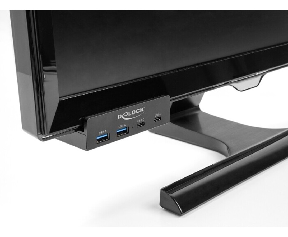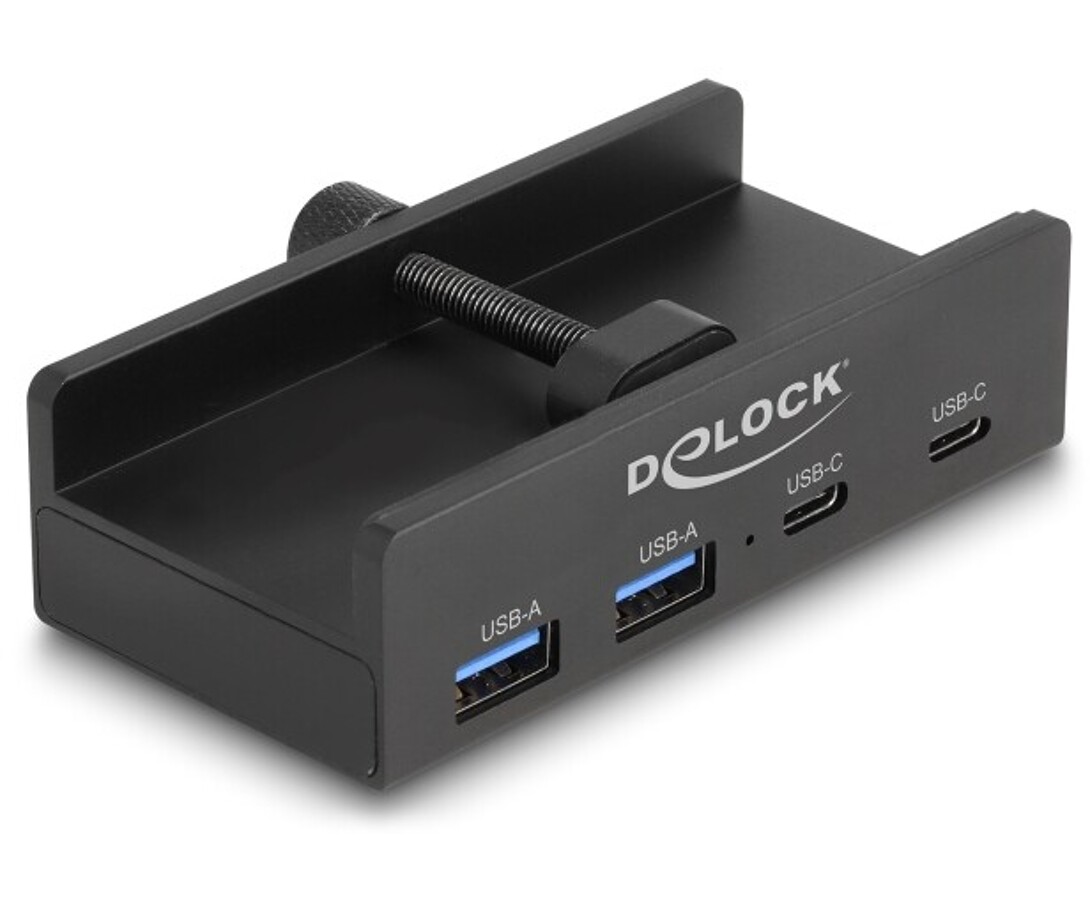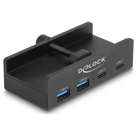 Hub USB marki Delock z interfejsem USB-A umożliwia rozszerzenie komputera o dwa dodatkowe porty USB-A oraz dwa porty USB-C, co pozwala na jednoczesne podłączenie różnych urządzeń peryferyjnych. Konstrukcja wyposażona w śrubę mocującą i silikonową podkładkę pozwala na stabilne zamocowanie koncentratora na monitorze, biurku lub innej powierzchni roboczej, dzięki czemu zawsze pozostaje w zasięgu ręki. Dodatkowe gniazdo USB-C umożliwia zasilanie podłączonych urządzeń, gdy energia z portu hosta jest niewystarczająca. Urządzenie zapewnia transfer danych do 5 Gbps i wykonane jest z wytrzymałych materiałów – aluminium i tworzywa sztucznego.